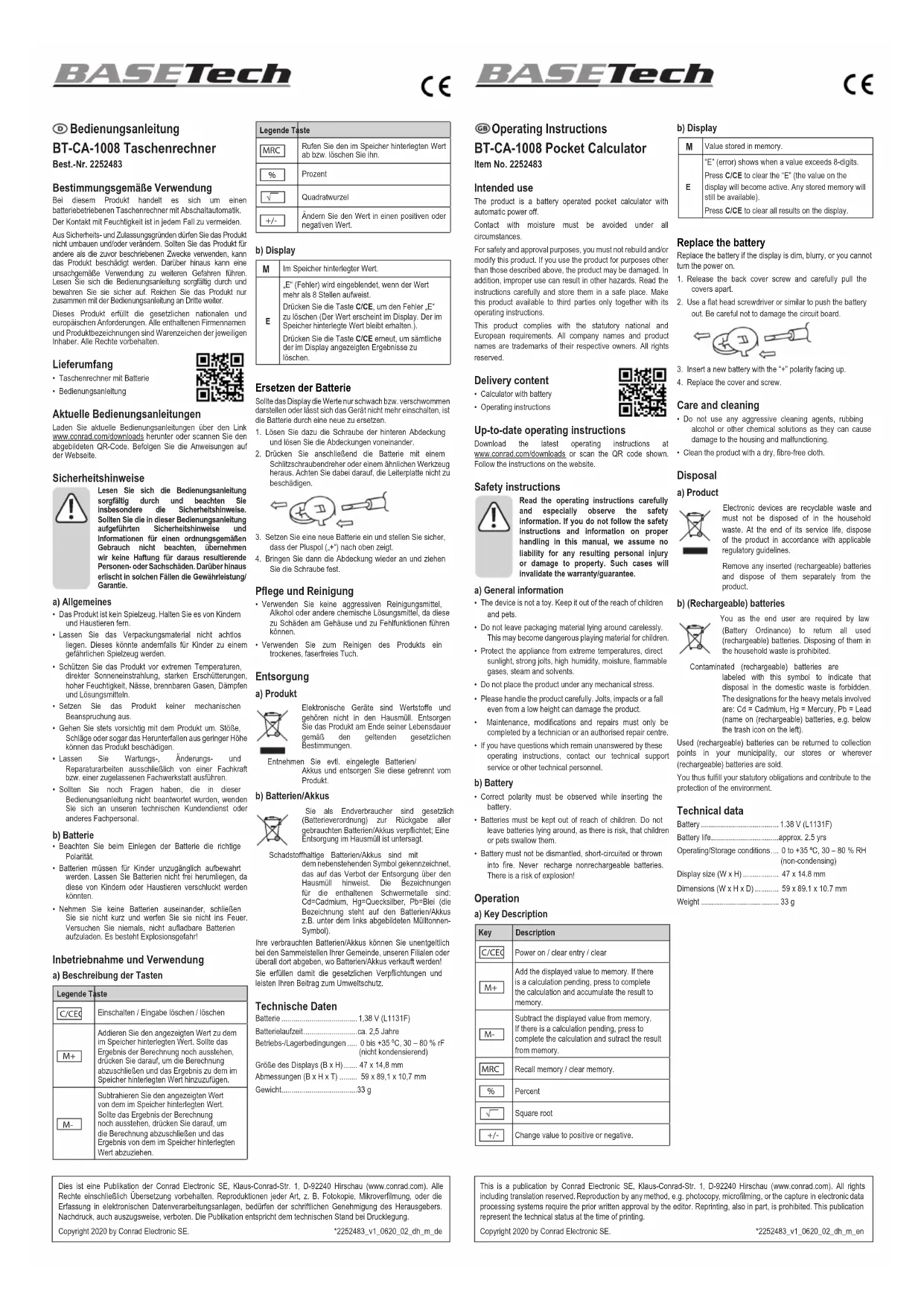 - Do not use any aggressive cleaning agents, rubbing alcohol or other chemical solutions as they can cause damage to the housing and malfunctioning.• Clean the product with a dry, bre-free cloth. Disposal a) Product Electronic devices are recyclable waste and must not be disposed of in the household waste. At the end of its service life, dispose of the product in accordance with applicable regulatory guidelines. Remove any inserted (rechargeable) batteries and dispose of them separately from the product. b) (Rechargeable) batteries You as the end user are required by law (Battery Ordinance) to return all used (rechargeable) batteries. Disposing of them in the household waste is prohibited. Contaminated (rechargeable) batteries are labeled with this symbol to indicate that disposal in the domestic waste is forbidden. The designations for the heavy metals involved are: Cd = Cadmium, Hg = Mercury, Pb = Lead (name on (rechargeable) batteries, e.g. below the trash icon on the left).Used (rechargeable) batteries can be returned to collection points in your municipality, our stores or wherever (rechargeable) batteries are sold.You thus fulll your statutory obligations and contribute to the protection of the environment. Technical data Battery ....................................... 1.38 V (L1131F)Battery life .................................. approx. 2.5 yrsOperating/Storage conditions .... 0 to +35 ºC, 30 – 80 % RH (non-condensing)Display size (W x H) .................. 47 x 14.8 mmDimensions (W x H x D) ............ 59 x 89.1 x 10.7 mmWeight ....................................... 33 gThis is a publication by Conrad Electronic SE, Klaus-Conrad-Str. 1, D-92240 Hirschau (www.conrad.com). All rights including translation reserved. Reproduction by any method, e.g. photocopy, microlming, or the capture in electronic data processing systems require the prior written approval by the editor. Reprinting, also in part, is prohibited. This publication represent the technical status at the time of printing.Copyright 2020 by Conrad Electronic SE. *2252483_v1_0620_02_dh_m_enMode d’emploi BT-CA-1008 Calculatrice de poche N° de commande 2252483 Utilisation prévue Le produit est une calculatrice de poche à piles avec extinction automatique.Dans tous les cas, le contact avec l’humidité doit être évité.Pour des raisons de sécurité et d’homologation, toute restructuration et/ou modication du produit est interdite. Toute utilisation à des ns autres que celles décrites ci-dessus pourrait endommager le produit. En outre, une mauvaise utilisation vous expose à d’autres risques. Lisez attentivement les instructions du mode d’emploi et conservez-le dans un endroit sûr. Ne mettez ce produit à la disposition de tiers qu’avec son mode d’emploi.Ce produit est conforme aux exigences nationales et européennes en vigueur. Tous les noms d’entreprises et appellations de produits sont des marques commerciales de leurs propriétaires respectifs. Tous droits réservés. Contenu de l’emballage