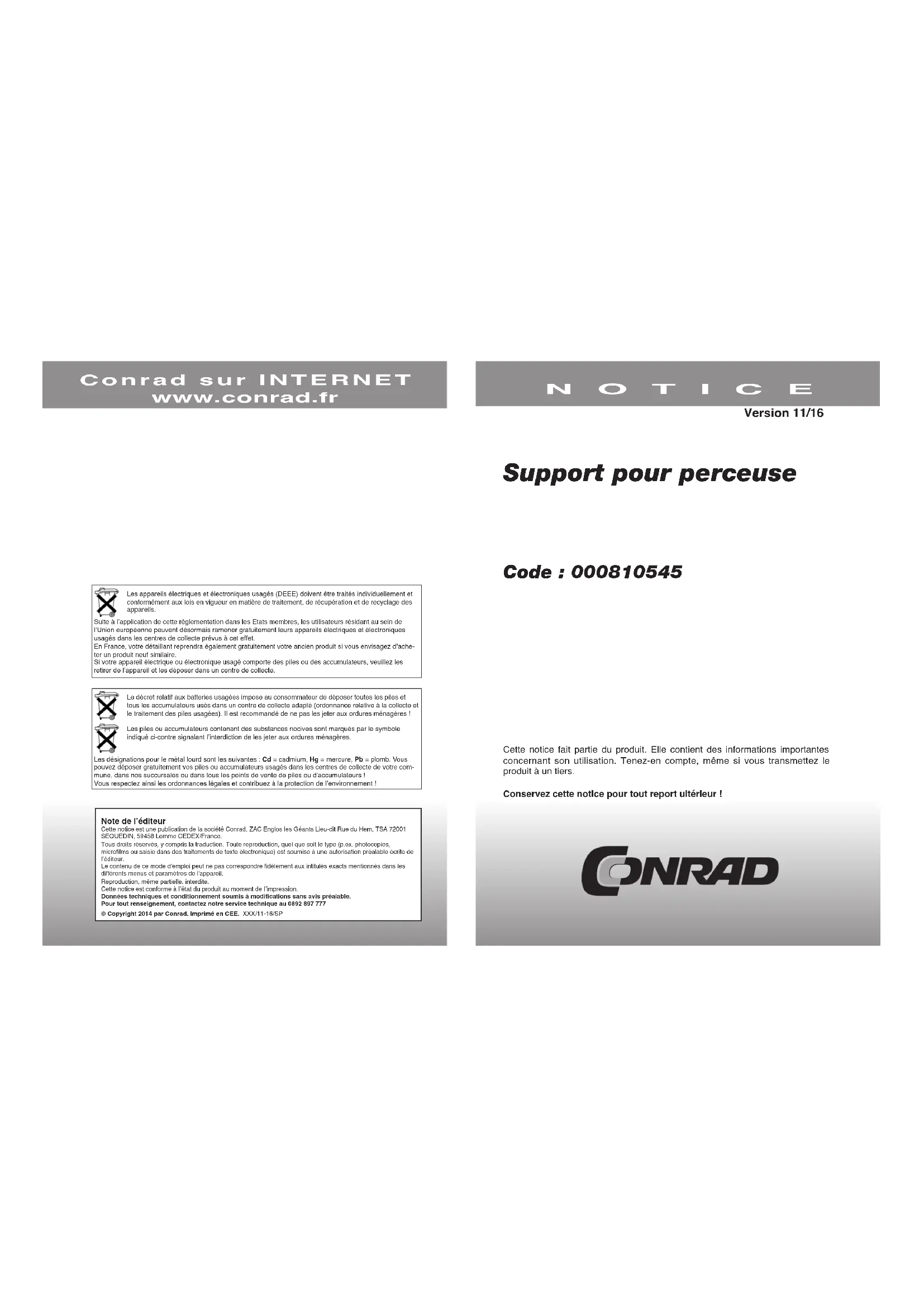 Support pour perceuse Code : 000810545 Cette notice fait partie du produit. Elle contient des informations importantes concernant son utilisation. Tenez-en compte, même si vous transmettez le produit à un tiers. Conservez cette notice pour tout report ultérieur ! NOTICE Conrad sur INTERNET www.conrad.fr Version 11/16 Les appareils électriques et électroniques usagés (DEEE) doivent être traités individuellement et conformément aux lois en vigueur en matière de traitement, de récupération et de recyclage des appareils.Suite à l’application de cette réglementation dans les Etats membres, les utilisateurs résidant au sein de l’Union européenne peuvent désormais ramener gratuitement leurs appareils électriques et électroniques usagés dans les centres de collecte prévus à cet effet. En France, votre détaillant reprendra également gratuitement votre ancien produit si vous envisagez d’ache- ter un produit neuf similaire.Si votre appareil électrique ou électronique usagé comporte des piles ou des accumulateurs, veuillez les retirer de l’appareil et les déposer dans un centre de collecte.Le décret relatif aux batteries usagées impose au consommateur de déposer toutes les piles et tous les accumulateurs usés dans un centre de collecte adapté (ordonnance relative à la collecte et le traitement des piles usagées). Il est recommandé de ne pas les jeter aux ordures ménagères !Les piles ou accumulateurs contenant des substances nocives sont marqués par le symbole indiqué ci-contre signalant l’interdiction de les jeter aux ordures ménagères. Les désignations pour le métal lourd sont les suivantes : Cd = cadmium, Hg = mercure, Pb = plomb. Vous pouvez déposer gratuitement vos piles ou accumulateurs usagés dans les centres de collecte de votre com-mune, dans nos succursales ou dans tous les points de vente de piles ou d'accumulateurs !Vous respectez ainsi les ordonnances légales et contribuez à la protection de l’environnement !Note de l’éditeurCette notice est une publication de la société Conrad, ZAC Englos les Géants Lieu-dit Rue du Hem, TSA 72001 SEQUEDIN, 59458 Lomme CEDEX/France.Tous droits réservés, y compris la traduction. Toute reproduction, quel que soit le type (p.ex. photocopies, microfilms ou saisie dans des traitements de texte électronique) est soumise à une autorisation préalable écrite de l’éditeur.Le contenu de ce mode d'emploi peut ne pas correspondre fidèlement aux intitulés exacts mentionnés dans les différents menus et paramètres de l'appareil.Reproduction, même partielle, interdite.Cette notice est conforme à l’état du produit au moment de l’impression.Données techniques et conditionnement soumis à modifications sans avis préalable.Pour tout renseignement, contactez notre service technique au 0892 897 777 © Copyright 2014 par Conrad. Imprimé en CEE. XXX/11-16/SP2 3 Article n° 1255-420 Hauteur totale 420 mm Hauteur de levée max. 80 mm Pour collier de serrage 43 mm Liste des pièces
