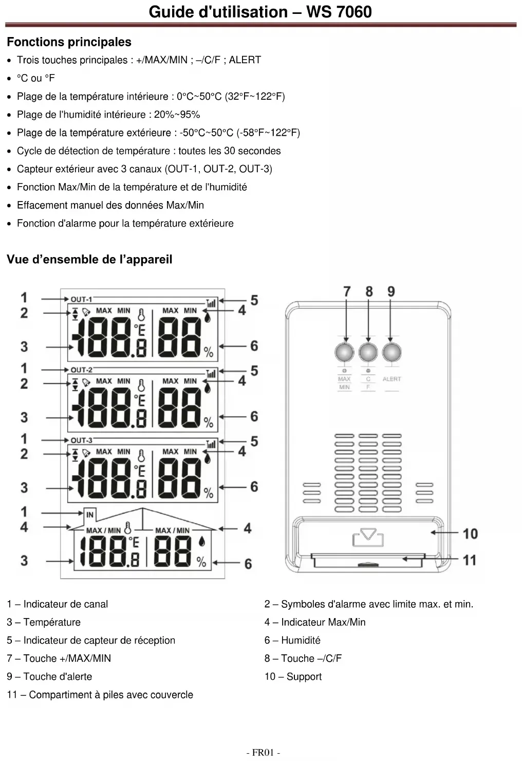 Première utilisation - Ouvrez les couvercles des compartiments à piles de tous les capteurs et de la station principale. - Assurez-vous que le numéro au niveau du Sélecteur de canal est identique à celui situé à l’avant du capteur. - Insérez 2 piles AAA dans le compartiment à piles de chacun des capteurs extérieurs. - Insérez 2 piles AAA dans le compartiment à piles de la station principale. - Fermez les couvercles des compartiments à piles de tous les capteurs extérieurs et de la station principale.Guide d'utilisation – WS 7060 - FR03 - - Lorsque la station principale est complètement chargée, tous les symboles restent affichés pendant 2 secondes, puis passe en mode réception des capteurs pendant 3 minutes. Placez les capteurs tout près de la station principale jusqu’à ce que tous les canaux affichent des mesures. Les capteurs extérieurs peuvent être placés éloignés de la station principale dès que tous les canaux reçoivent des mesures. Remarque : En cas d’échec de réception d'un capteur après 3 minutes, le symbole de réception de son canal disparaît. Dans ce cas, redémarrez l’opération initiale avec des piles neuves jusqu’à ce que tous les capteurs soient connectés. Réglage de l'alarme de température - En mode affichage normal, maintenez appuyée la touche Alert pendant 3 secondes pour passer en mode réglage d’alerte - En mode réglage d’alerte, utilisez les touches +/– pour sélectionner un canal extérieur. - Appuyez sur la touche Alert pour confirmer le canal sélectionné. Le symbole de limite inférieure se met à clignoter. - Utilisez les touches +/– pour modifier la valeur de la limite inférieure. - Appuyez sur la touche Alert pour confirmer les changements d’alerte. Le symbole de limite supérieure se met à clignoter. - Utilisez les touches +/– pour modifier la valeur de la limite supérieure. - Appuyez sur la touche Alert pour confirmer les changements d’alerte. Les symboles de limite supérieure et inférieure se mettent à clignoter. - Utilisez les touches +/– pour activer l’alarme ; le symbole de l’alarme se met à clignoter. Utilisez les touches +/– pour désactiver l’alarme ; le symbole d’alarme disparait. - Appuyez sur la touche Alert pour confirmer les changements d’alerte et quitter le mode réglage de l’alerte. Remarque : - Le symbole d’alarme reste affiché dans le canal correspondant tant que l’alarme est activée. - La valeur de limite inférieure par défaut est 0°C, la valeur de limite supérieure par défaut est de 35°C. - En mode réglage de l’alerte, si aucune opération n’est effectuée pendant 20 secondes, la station retourne au mode normal. - En mode réglage de l’alerte, utilisez les touches +/– pour changer une valeur par pas de 1 ou maintenez appuyée l'une des touche +/– pour aller rapidement. Alarme de température - Cette station dispose d’une limite supérieure et inférieure pour 3 alarmes, une pour chaque canal extérieur. - Si la température atteint une valeur supérieure à la limite supérieure ou inférieure à la limite inférieure, alors le symbole , , ou se met à clignoter et l’alarme retentit.Guide d'utilisation – WS 7060 - FR04 - - En cas d'alarme, appuyez sur une touche pour arrêter l'alarme, mais le symbole reste clignotant. L’alarme s’éteint automatiquement après 1 minute, si aucune touche n’est appuyée. - Le symbole cesse de clignoter une fois la température n’est plus en dehors de la plage de température définie. Remarque - L’alarme peut être désactivée en permanence à l’aide du réglage de la température de l’alarme. Réception des capteurs extérieurs - En effectuant l'opération initiale ou une réception manuelle, le mode réception extérieure s’effectue pendant 3 minutes et le symbole de réception se met à clignoter. - Maintenez appuyée la touche – pendant 3 secondes pour lancer le mode réception extérieure de façon manuelle. - Le mode réception extérieure est considéré réussi une fois chaque canal affiche des valeurs et le symbole de réception s’affiche en permanence à l’écran. Remarque : - Lorsque les données du capteur dans chaque canal ne reçoivent pas le même code ID au bout d'une heure, le canal affiche la dernière valeur reçue clignotante, puis passe en mode réception extérieure pendant 3 minutes. Au bout d’une heure, elle efface le code ID et passe en mode réception RF pendant 3 minutes ; pendant ce temps, le canal affiche --.-, effaçant ainsi les valeurs Max/Min. Elle répète cette opération jusqu'à ce qu'un signal soit reçu. - Lorsque les données du capteur sont perdues, mais le signal est à nouveau reçu, la date du capteur sera affichée et la valeur MAX/MIN enregistrée Valeurs MIN/MAX - Les valeurs les plus basses et les plus élevées de chaque canal seront enregistrées et peuvent être affichées à tout moment. - En mode d'affichage normal, appuyez une fois sur la touche +/MAX/MIN pour afficher les valeurs MAX dans chaque canal. - Appuyez à nouveau sur la touche +/MAX/MIN pour afficher les valeurs MIN. - Appuyez sur la touche +/MAX/MIN pour retourner au mode affichage normal. - Pour effacer toutes les valeurs enregistrées, maintenez appuyée la touche +/MAX/MIN pendant 3 secondes et les valeurs disparaissent de l’écran pendant 1 seconde pour indiquer que les valeurs ont été effacées avec succès. Unité de température affichée - En mode affichage normal, appuyez sur la touche –/C/F pour basculer entre les unités de température Celsius et Fahrenheit.Guide d'utilisation – WS 7060 - FR05 - Plage de température et d'humidité - Plage de température intérieure : 0°C~50°C (32°F~122°F) - Cycle de test : toutes les 30 secondes - Plage de température extérieure : -50°C~50°C (-58°F~122°F) - Plage d'humidité intérieure/extérieure : 20%~95% - Lorsque la valeur de la température est supérieure à la plage, la station affi