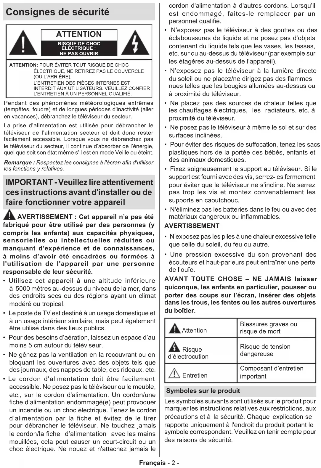 AVERTISSEMENT N'exposez pas les piles à une chaleur excessive telle que celle du soleil, du feu ou autre. Une pression excessive du son provenant des écouteurs et haut-parleurs peut entraîner une perte de l’ouïe. AVANT TOUTE CHOSE – NE JAMAIS laisser quiconque, les enfants en particulier, pousser ou porter des coups sur l’écran, insérer des objets dans les trous, les fentes ou les autres ouvertures du boîtier. Attention Blessures graves ou risque de mort Risque d’électrocution Risque de tension dangereuse Entretien Composant d’entretien important Symboles sur le produit Les symboles suivants sont utilisés sur le produit pour marquer les instructions relatives aux restrictions, aux