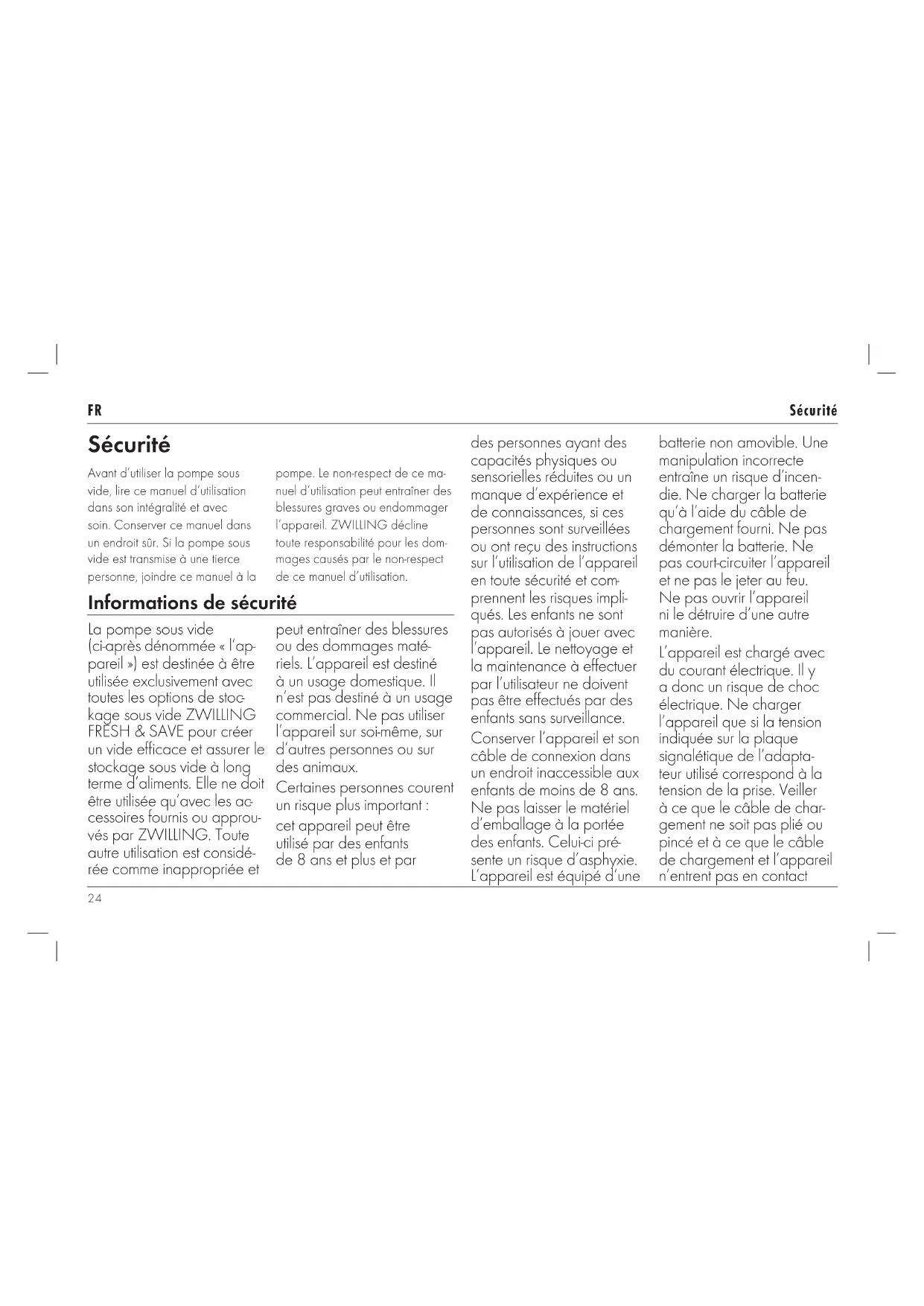 Sécurité Avant d’utiliser la pompe sous vide, lire ce manuel d’utilisation dans son intégralité et avec soin. Conserver ce manuel dans unendroit sûr. Si la pompe sous vide esttransmise à une tierce personne, joindre ce manuel à la pompe. Le non-respect de ce ma- nuel d’utilisation peut entraîner des blessures graves ou endommager l’appareil. ZWILLING décline toute responsabilité pour les dom- mages causés par le non-respect de ce manuel d’utilisation. Informations de sécurité La pompe sous vide (ci-après dénommée «l’ap- pareil») est destinée à être utilisée exclusivement avec toutes les options de stoc