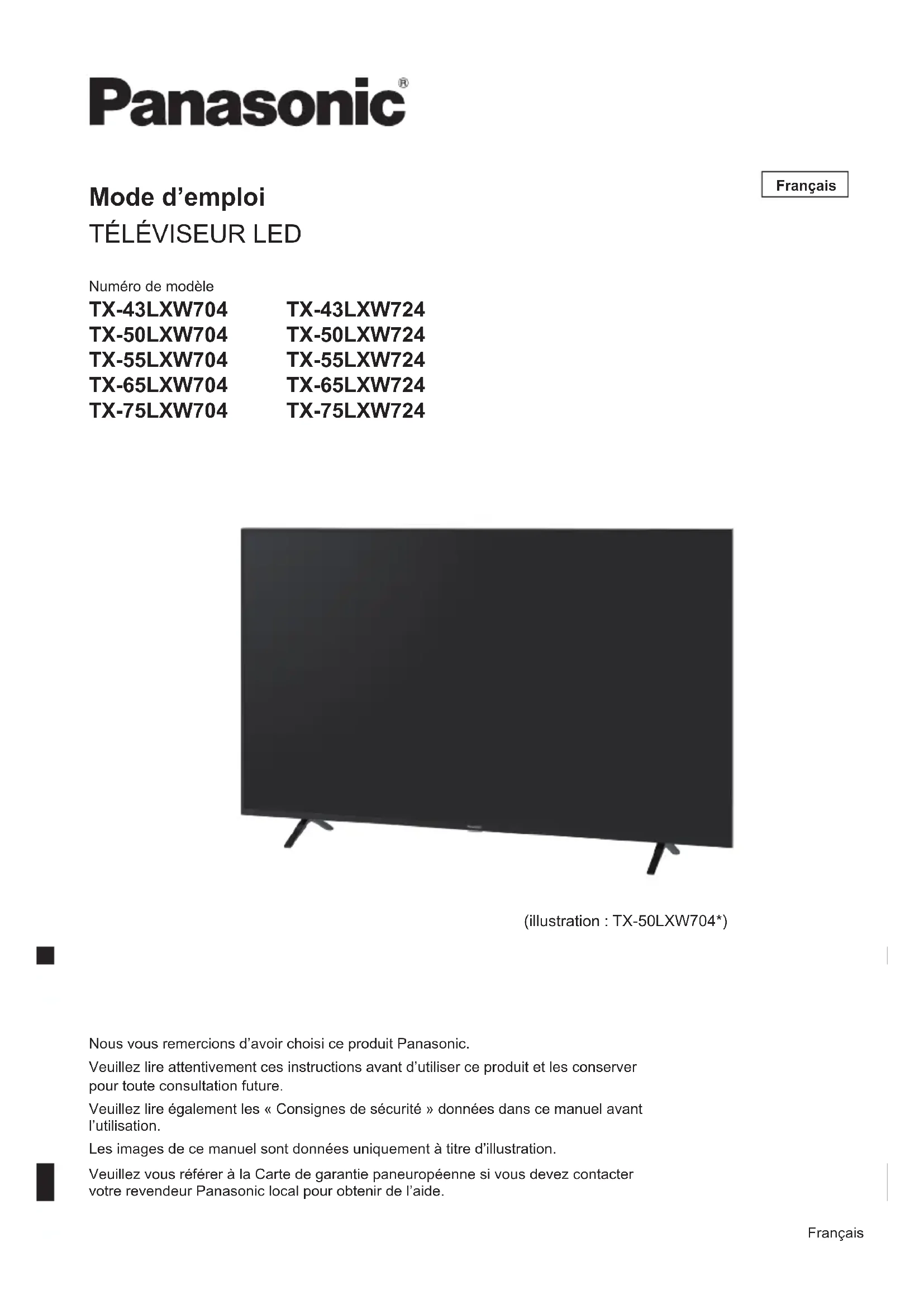 Français Nous vous remercions d’avoir choisi ce produit Panasonic. Veuillez lire attentivement ces instructions avant d’utiliser ce produit et les conserver pour toute consultation future. Veuillez lire également les « Consignes de sécurité » données dans ce manuel avant l’utilisation. Les images de ce manuel sont données uniquement à titre d’illustration. Veuillez vous référer à la Carte de garantie paneuropéenne si vous devez contacter votre revendeur Panasonic local pour obtenir de l’aide. (illustration : TX-50LXW704*) FrançaisFrançais