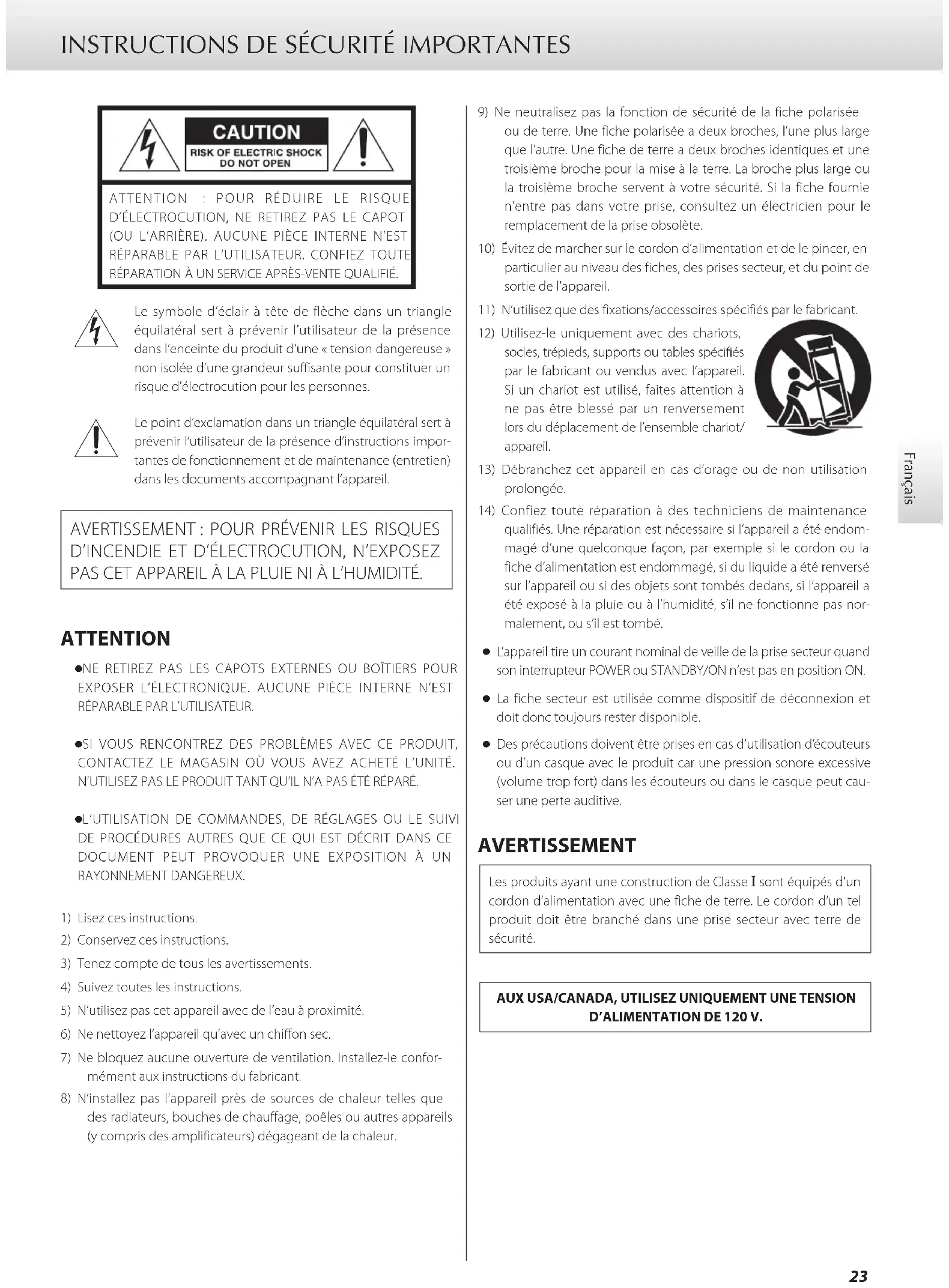 D’INCENDIE ET D’ÉLECTROCUTION, N’EXPOSEZ PAS CET APPAREIL À LA PLUIE NI À L’HUMIDITÉ. ATTENTION o NE RETIREZ PAS LES CAPOTS EXTERNES OU BOÎTIERS POUR EXPOSER L’ÉLECTRONIQUE. AUCUNE PIÈCE INTERNE N’EST RÉPARABLE PAR L’UTILISATEUR. o SI VOUS RENCONTREZ DES PROBLÈMES AVEC CE PRODUIT, CONTACTEZ LE MAGASIN OÙ VOUS AVEZ ACHETÉ L’UNITÉ. N’UTILISEZ PAS LE PRODUIT TANT QU’IL N’A PAS ÉTÉ RÉPARÉ. o L’UTILISATION DE COMMANDES, DE RÉGLAGES OU LE SUIVI DE PROCÉDURES AUTRES QUE CE QUI EST DÉCRIT DANS CE DOCUMENT PEUT PROVOQUER UNE EXPOSITION À UN RAYONNEMENT DANGEREUX.1) Lisez ces instructions.2) Conservez ces instructions.3) Tenez compte de tous les avertissements.4) Suivez toutes les instructions.5) N’utilisez pas cet appareil avec de l’eau à proximité.6) Ne nettoyez l’appareil qu’avec un chiffon sec.7) Ne bloquez aucune ouverture de ventilation. Installez-le confor-mément aux instructions du fabricant.8) N’installez pas l’appareil près de sources de chaleur telles que des radiateurs, bouches de chauffage, poêles ou autres appareils (y compris des amplificateurs) dégageant de la chaleur.9) Ne neutralisez pas la fonction de sécurité de la fiche polarisée ou de terre. Une fiche polarisée a deux broches, l’une plus large que l’autre. Une fiche de terre a deux broches identiques et une troisième broche pour la mise à la terre. La broche plus large ou la troisième broche servent à votre sécurité. Si la fiche fournie n’entre pas dans votre prise, consultez un électricien pour le remplacement de la prise obsolète.10) Évitez de marcher sur le cordon d’alimentation et de le pincer, en particulier au niveau des fiches, des prises secteur, et du point de sortie de l’appareil.11) N’utilisez que des fixations/accessoires spécifiés par le fabricant.12) Utilisez-le uniquement avec des chariots, socles, trépieds, supports ou tables spécifiés par le fabricant ou vendus avec l’appareil. Si un chariot est utilisé, faites attention à ne pas être blessé par un renversement lors du déplacement de l’ensemble chariot/appareil.13) Débranchez cet appareil en cas d’orage ou de non utilisation prolongée.14) Confiez toute réparation à des techniciens de maintenance qualifiés. Une réparation est nécessaire si l’appareil a été endom-magé d’une quelconque façon, par exemple si le cordon ou la fiche d’alimentation est endommagé, si du liquide a été renversé sur l’appareil ou si des objets sont tombés dedans, si l’appareil a été exposé à la pluie ou à l’humidité, s’il ne fonctionne pas nor-malement, ou s’il est tombé. o L’appareil tire un courant nominal de veille de la prise secteur quand son interrupteur POWER ou STANDBY/ON n’est pas en position ON. o La fiche secteur est utilisée comme dispositif de déconnexion et doit donc toujours rester disponible. o Des précautions doivent être prises en cas d’utilisation d’écouteurs ou d’un casque avec le produit car une pression sonore excessive (volume trop fort) dans les écouteurs ou dans le casque peut cau-ser une perte auditive. AVERTISSEMENT Les produits ayant une construction de Classe ! sont équipés d’un cordon d’alimentation avec une fiche de terre. Le cordon d’un tel produit doit être branché dans une prise secteur avec terre de sécurité.AUX USA/CANADA, UTILISEZ UNIQUEMENT UNE TENSION D’ALIMENTATION DE 120 V.24 INSTRUCTIONS DE SÉCURITÉ IMPORTANTES (suite) ATTENTION o N’exposez pas cet appareil aux gouttes ni aux éclaboussures. o Ne placez pas d’objet rempli de liquide sur l’appareil, comme par exemple un vase. o N’installez pas cet appareil dans un espace confiné comme une bibliothèque ou un meuble similaire. o L’appareil doit être placé suffisamment près de la prise de cou- rant pour que vous puissiez à tout moment attraper facilement la fiche du cordon d’alimentation. o Si le produit utilise des piles/batteries (y compris un pack de batteries ou des piles installées), elles ne doivent pas être exposées au soleil, au feu ou à une chaleur excessive. o PRÉCAUTION pour les produits qui utilisent des batteries rem- plaçables au lithium: remplacer une batterie par un modèle incorrect entraîne un risque d’explosion. Remplacez-les uni- quement par un type identique ou équivalent. Modèle pour le Canada Déclaration de conformité d’Industrie Canada : CET APPAREIL NUMÉRIQUE DE LA CLASSE B EST CONFORME À LA