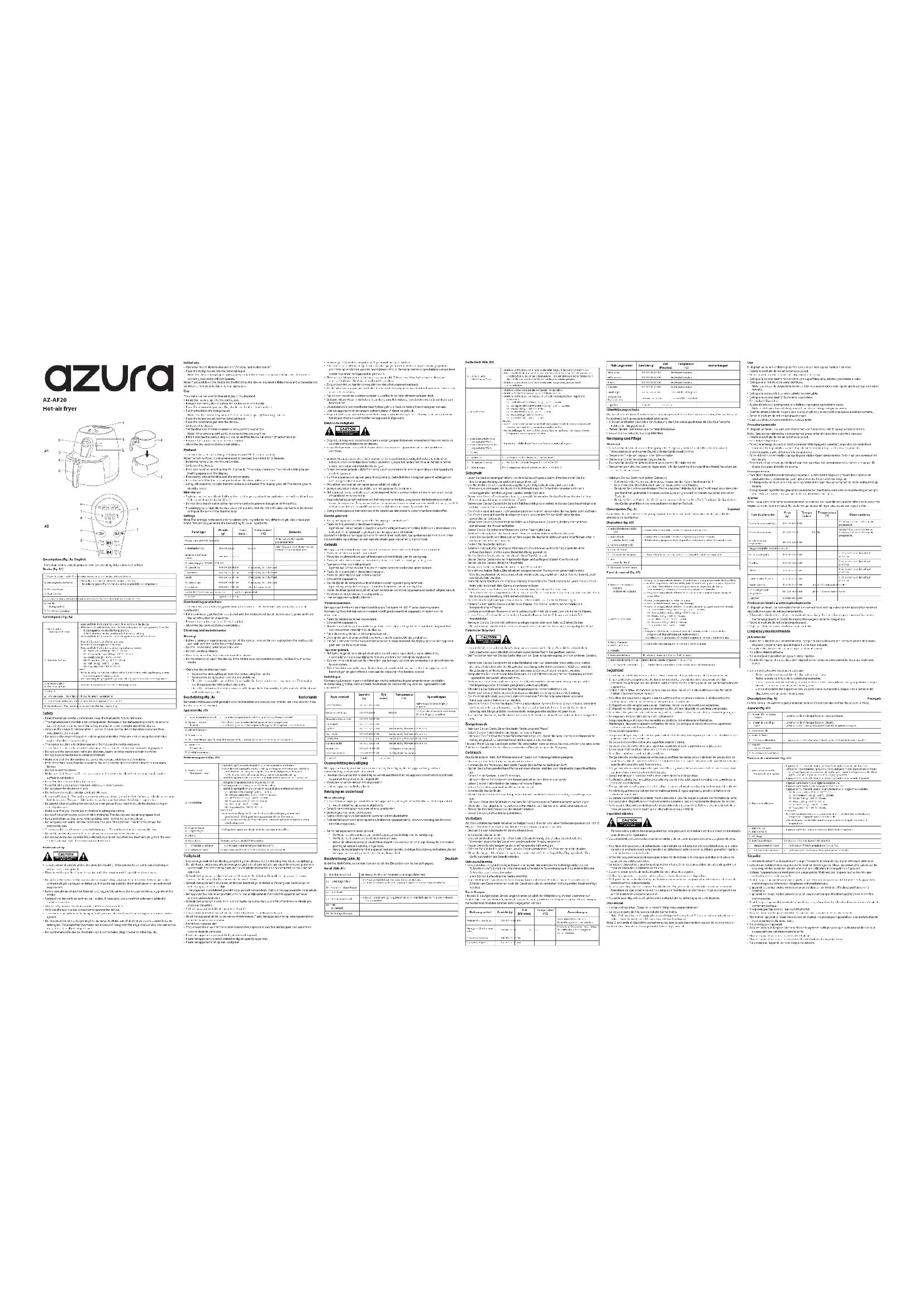 - Lisez attentivement le manuel avant usage. Conservez le manuel pour toute référence ultérieure.• Le fabricant décline toute responsabilité pour les dommages ou blessures consécutifs causés par le non-respect des consignes de sécurité et d’une utilisation inappropriée de l’appareil.• Utilisez l’appareil uniquement pour son usage prévu. N’utilisez pas l’appareil à d’autres ns que celles décrites dans le manuel.• N’utilisez pas l’appareil si une pièce quelconque est endommagée ou défectueuse. Si l’appareil est endommagé ou défectueux, remplacez-le immédiatement.• L’appareil est conçu exclusivement pour une utilisation en intérieur. N’utilisez pas l’appareil à l’extérieur.• L’appareil est conçu exclusivement pour un usage domestique. N’utilisez pas l’appareil à des ns commerciales.• N’utilisez pas l’appareil à proximité d’une baignoire, d’une douche, d’un lavabo ou d’autres récipients contenant de l’eau.• N’exposez pas l’appareil à l’eau ou à l’humidité.• Assurez-vous que l’appareil n’entre en contact avec aucune matière inammable.• Maintenez l’appareil à l’écart des sources de chaleur. Ne placez pas l’appareil sur une surface chaude ou à proximité de ammes nues.• Ne couvrez pas l’appareil.• Assurez-vous que l’appareil dispose d’un dégagement susant pour que la chaleur se dissipe tout en assurant une ventilation satisfaisante.• Placez l’appareil sur une surface stable et plane.• Placez l’appareil sur une surface résistante à la chaleur et aux projections.• Ne placez pas l’appareil sur une plaque de cuisson. AZ-AF20 Hot-air fryer POWERHEATING