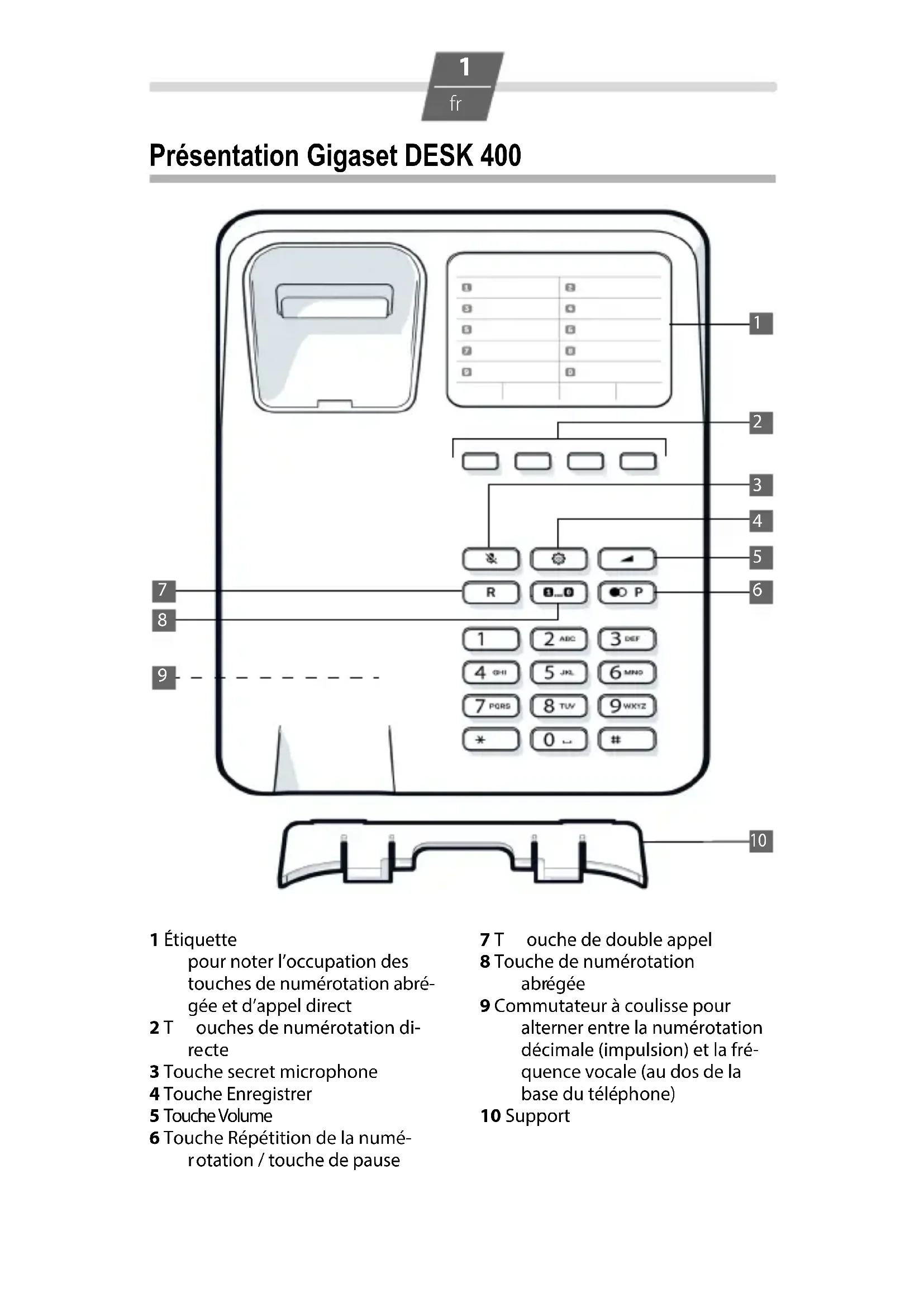 Gigaset DESK 400 / FR fr/ A30054-M6538-N101-3-7719 / DESK400_fr.fm / 25.11.2022 Présentation Gigaset DESK 400 1 Étiquette pour noter l’occupation des tou ches de numérotation abré- gée et d’appel direct 2 T ouches de numérotation di-