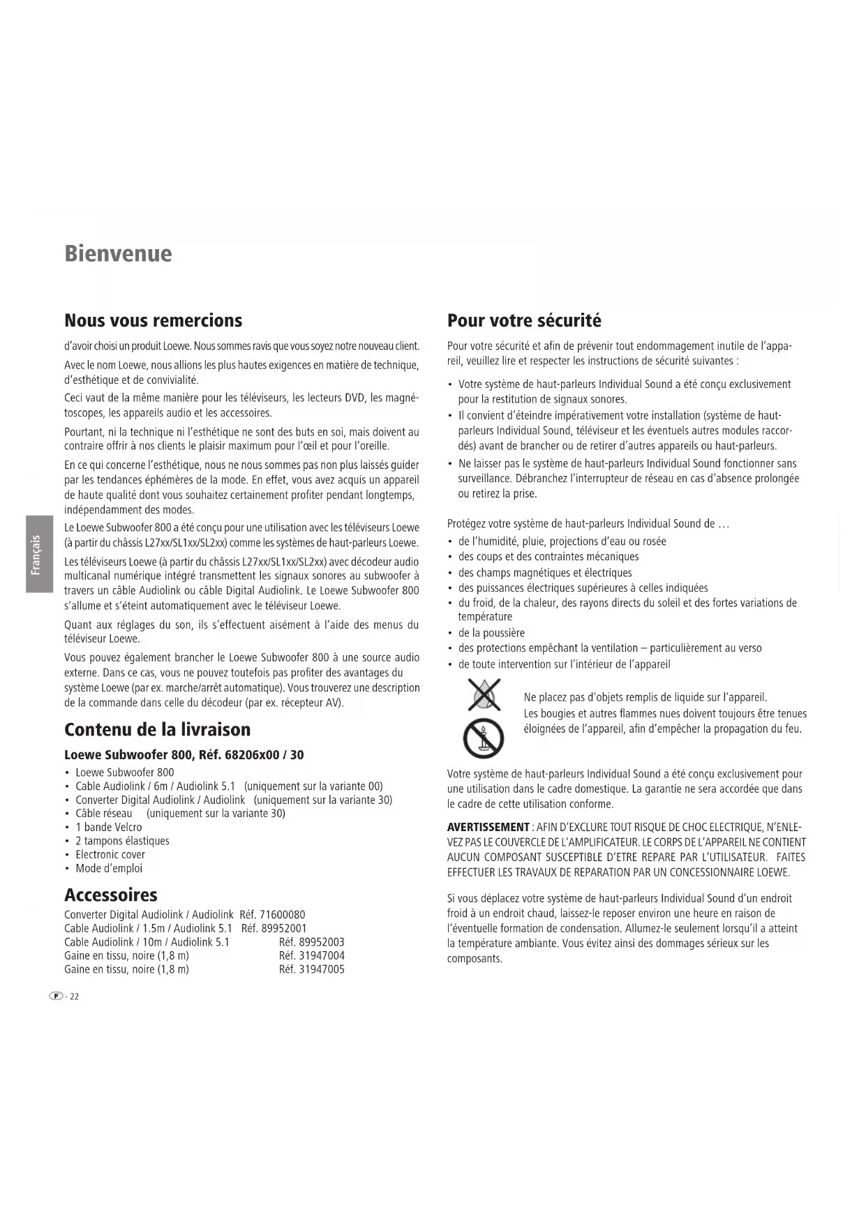 Deutsch English Français Italiano Español Nederlands Technical Data Subwoofer Dimensions of subwoofer in cm (W x H x D) 43 x 34,5 x 43 Weight subwoofer in kg 27 Digital output stages 6 channels Principle 1 way, active 250 mm; 2 way, passive 250 mm Mains voltage 220 – 240 Volt; 50/60 Hz Max. power consumption 900 Watts Nominal power consumption 170 Watts Power consumption on standby 0 Watt Bass intensity ±12 dB Transmission range subwoofer 300 W 27 Hz – 300 Hz - 6dB Transmission range channels 5 x 100 W 5 Hz – 50 kHz - 3dB Phase switch yes Power switch yes Mode switch yes System link Audiolink 25-pole D-Sub Line In RCA socket 6x: FL, Center, FR, RL, Subw, RR Disposal Cardboard box and packaging You have opted for a durable and technically sophisticated product. In line with national regulations regarding the disposal of packaging materials, we pay a fee to authorised recyclers who collect packaging from dealers. However, we recommend that you keep the original cardboard box and the rest of the pa- ckaging materials so that the unit can, if necessary, be transported in the safest possible conditions. The unit Important: The EU Directive 2002/96/EG governs the proper re-acceptance, handling and recycling of used electronic appliances. Old electronic appliances must therefore be disposed of sepa- rately. Never throw this set in the normal domestic waste. You can hand in your old set free of charge at identi ed collection points or at your dealer if you buy a similar new set. Other details about re-acceptance (also for non-EU countries) are available from your local administration. Masthead Loewe Technologies GmbH Industriestraße 11 D-96317 Kronach www.loewe.de Printed in Germany Editorial date 06/14-7 TB © Loewe Technologies GmbH, Kronach All rights including translation, technical modifications and errors reserved. Design and technical specifications are subject to change without notice.- 22 Deutsch English Français Italiano Español Nederlands Bienvenue Nous vous remercions d’avoir choisi un produit Loewe. Nous sommes ravis que vous soyez notre nouveau client. Avec le nom Loewe, nous allions les plus hautes exigences en matière de technique, d’esthétique et de convivialité. Ceci vaut de la même manière pour les téléviseurs, les lecteurs DVD, les magné- toscopes, les appareils audio et les accessoires. Pourtant, ni la technique ni l‘esthétique ne sont des buts en soi, mais doivent au contraire offrir à nos clients le plaisir maximum pour l‘œil et pour l‘oreille. En ce qui concerne l‘esthétique, nous ne nous sommes pas non plus laissés guider par les tendances éphémères de la mode. En effet, vous avez acquis un appareil de haute qualité dont vous souhaitez certainement proter pendant longtemps, indépendamment des modes. Le Loewe Subwoofer 800 a été conçu pour une utilisation avec les téléviseurs Loewe (à partir du châssis L27xx/SL1xx/SL2xx) comme les systèmes de haut-parleurs Loewe. Les téléviseurs Loewe (à partir du châssis L27xx/SL1xx/SL2xx) avec décodeur audio multicanal numérique intégré transmettent les signaux sonores au subwoofer à travers un câble Audiolink ou câble Digital Audiolink. Le Loewe Subwoofer 800 s‘allume et s‘éteint automatiquement avec le téléviseur Loewe. Quant aux réglages du son, ils s’effectuent aisément à l’aide des menus du téléviseur Loewe. Vous pouvez également brancher le Loewe Subwoofer 800 à une source audio externe. Dans ce cas, vous ne pouvez toutefois pas proter des avantages du système Loewe (par ex. marche/arrêt automatique). Vous trouverez une description de la commande dans celle du décodeur (par ex. récepteur AV). Contenu de la livraison Loewe Subwoofer 800, Réf. 68206x00 / 30