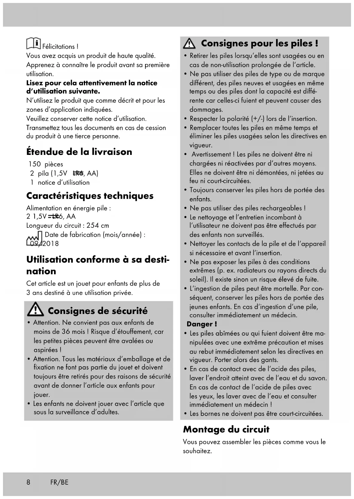 - s‘il présente les qualités qu‘un acheteur peut légitimement attendre eu égard aux déclara- tions publiques faites par le vendeur, par le producteur ou par son représentant, notamment dans la publicité ou l‘étiquetage ; 2° Ou s‘il présente les caractéristiques définies d‘un commun accord par les parties ou être pro- pre à tout usage spécial recherché par l‘acheteur, porté à la connaissance du vendeur et que ce dernier a accepté. Article L217-12 du Code de la consommation L‘action résultant du défaut de conformité se prescrit par deux ans à compter de la délivrance du bien. Article 1641 du Code civil Le vendeur est tenu de la garantie à raison des défauts cachés de la chose vendue qui la rendent impropre à l‘usage auquel on la destine, ou qui diminuent tellement cet usage que l‘acheteur ne l‘aurait pas acquise, ou n‘en aurait donné qu‘un moindre prix, s‘il les avait connus. Article 1648 1er alinéa du Code civil L‘action résultant des vices rédhibitoires doit être intentée par l‘acquéreur dans un délai de deux ans à compter de la découverte du vice. Les pièces détachées indispensables à l’utilisation du produit sont disponibles pendant la durée de la garantie du produit. IAN : 306107 Service France Tel. : 0800 919270 E-Mail : deltasport@lidl.fr Service Belgique Tel. : 070 270 171 (0,15 EUR/Min.) E-Mail : deltasport@lidl.be11NL/BE Hartelijk gefeliciteerd! Met de aankoop hebt u gekozen voor een hoogwaardig product. Maak u daarom voor de eerste ingebruikname vertrouwd met het product. Lees hiervoor deze gebruiksaanwijzing aandachtig door. Gebruik het product alleen zoals beschreven en uitsluitend voor de aangegeven doeleinden. Bewaar de gebruiksaanwijzing zorgvuldig. Als u het product aan derden geeft, dient u ook deze documenten te overhandigen. Leveringsomvang 150 x deel 2 x batterij (1,5V LR6, AA) 1 x gebruiksaanwijzing Technische gegevens Stroomvoorziening batterij: 2 x 1,5V LR6, AA Baanlengte: 254 cm Productiedatum (maand/jaar): 09/2018 Beoogd gebruik Dit artikel is speelgoed voor kinderen vanaf 3 jaar oud voor privégebruik. Veiligheidstips