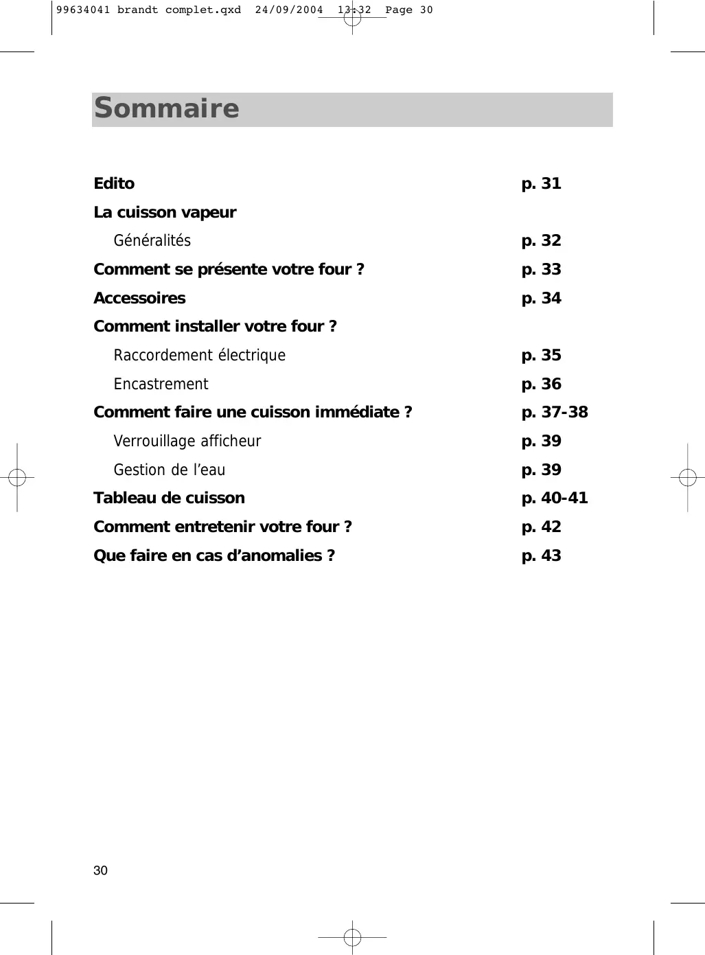 99634041 brandt complet.qxd 24/09/2004 13:32 Page 30 S ommaire Edito p. 31 La cuisson vapeur Généralités p. 32 Comment se présente votre four ? p. 33 Accessoires p. 34 Comment installer votre four ? Raccordement électrique p. 35 Encastrement p. 36 Comment faire une cuisson immédiate ? p. 37-38 Verrouillage afficheur p. 39 Gestion de l’eau p. 39 Tableau de cuisson p. 40-41 Comment entretenir votre four ? p. 42 Que faire en cas d’anomalies ? p. 43