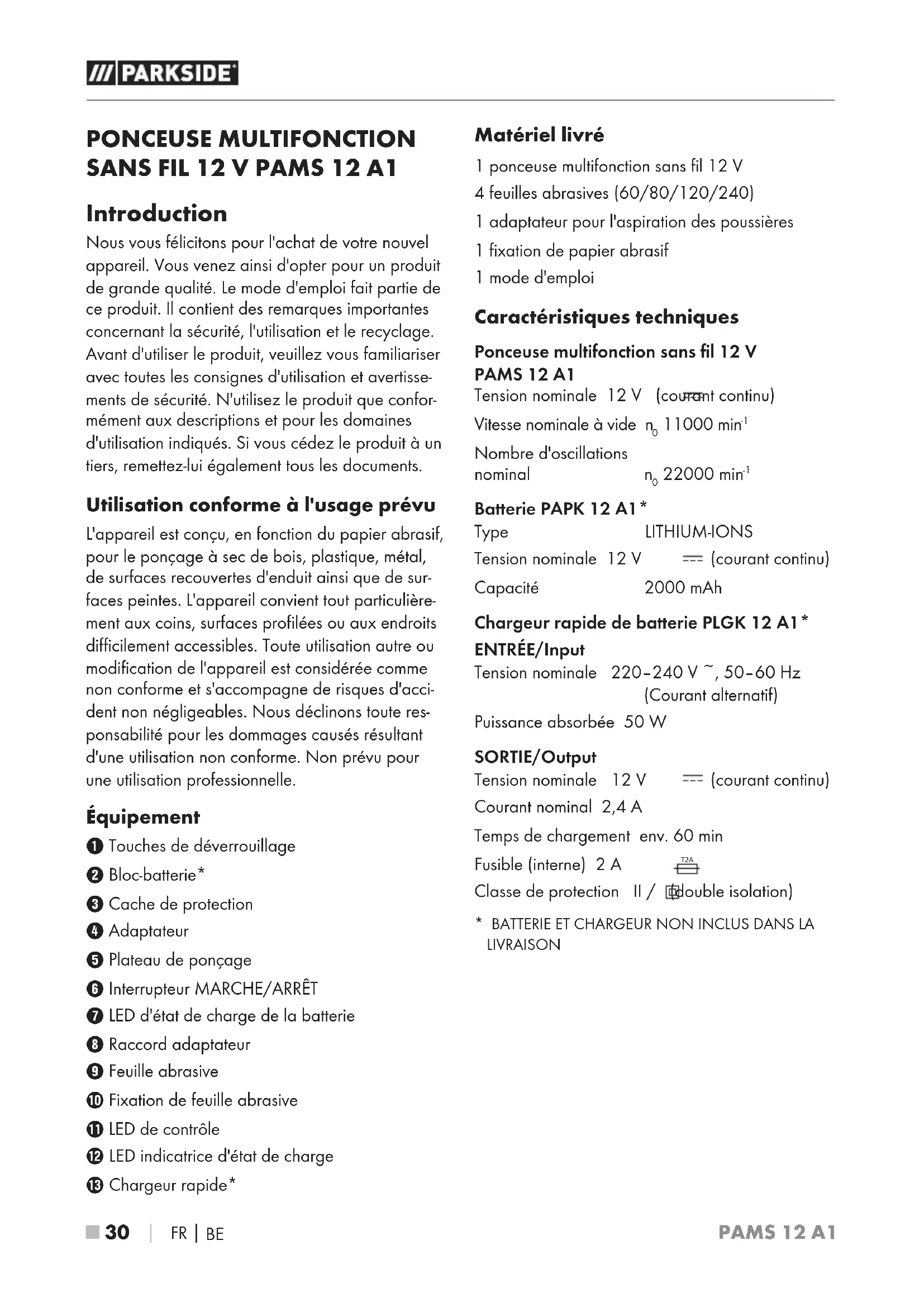 Introduction Nous vous félicitons pour l'achat de votre nouvel appareil. Vous venez ainsi d'opter pour un produit de grande qualité. Le mode d'emploi fait partie de ce produit. Il contient des remarques importantes concernant la sécurité, l'utilisation et le recyclage. Avant d'utiliser le produit, veuillez vous familiariser avec toutes les consignes d'utilisation et avertisse- ments de sécurité. N'utilisez le produit que confor- mément aux descriptions et pour les domaines d'utilisation indiqués. Si vous cédez le produit à un tiers, remettez-lui également tous les documents. Utilisation conforme à l'usage prévu L'appareil est conçu, en fonction du papier abrasif, pour le ponçage à sec de bois, plastique, métal, de surfaces recouvertes d'enduit ainsi que de sur- faces peintes. L'appareil convient tout particulière- ment aux coins, surfaces profilées ou aux endroits difficilement accessibles. Toute utilisation autre ou modification de l'appareil est considérée comme non conforme et s'accompagne de risques d'acci- dent non négligeables. Nous déclinons toute res- ponsabilité pour les dommages causés résultant d'une utilisation non conforme. Non prévu pour une utilisation professionnelle. Équipement 1 Touches de déverrouillage 2 Bloc-batterie* 3 Cache de protection 4 Adaptateur 5 Plateau de ponçage 6 Interrupteur MARCHE/ARRÊT 7 LED d'état de charge de la batterie 8 Raccord adaptateur 9 Feuille abrasive 0 Fixation de feuille abrasive q LED de contrôle w LED indicatrice d'état de charge e Chargeur rapide* Matériel livré 1 ponceuse multifonction sans fil 12 V 4 feuilles abrasives (60/80/120/240) 1 adaptateur pour l'aspiration des poussières 1 fixation de papier abrasif 1 mode d'emploi Caractéristiques techniques Ponceuse multifonction sans fil 12 V PAMS 12 A1 Tension nominale 12 V (courant continu) Vitesse nominale à vide n