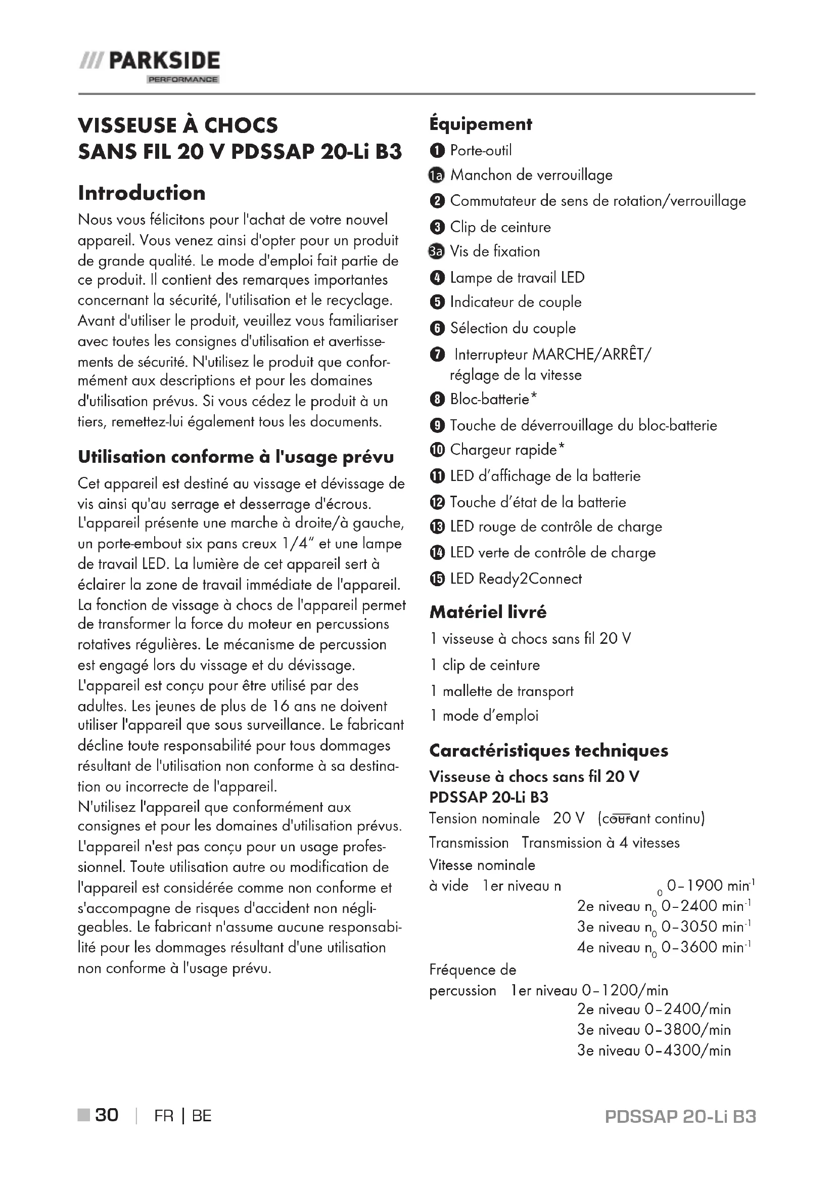 VISSEUSE À CHOCS SANS FIL 20 V PDSSAP 20-Li B3 Introduction Nous vous félicitons pour l'achat de votre nouvel appareil. Vous venez ainsi d'opter pour un produit de grande qualité. Le mode d'emploi fait partie de ce produit. Il contient des remarques importantes concernant la sécurité, l'utilisation et le recyclage. Avant d'utiliser le produit, veuillez vous familiariser avec toutes les consignes d'utilisation et avertisse- ments de sécurité. N'utilisez le produit que confor- mément aux descriptions et pour les domaines d'utilisation prévus. Si vous cédez le produit à un tiers, remettez-lui également tous les documents. Utilisation conforme à l'usage prévu Cet appareil est destiné au vissage et dévissage de vis ainsi qu'au serrage et desserrage d'écrous. L'appareil présente une marche à droite/à gauche, un porte-embout six pans creux 1/4“ et une lampe de travail LED. La lumière de cet appareil sert à éclairer la zone de travail immédiate de l'appareil. La fonction de vissage à chocs de l'appareil permet de transformer la force du moteur en percussions rotatives régulières. Le mécanisme de percussion est engagé lors du vissage et du dévissage. L'appareil est conçu pour être utilisé par des adultes. Les jeunes de plus de 16 ans ne doivent utiliser l'appareil que sous surveillance. Le fabricant décline toute responsabilité pour tous dommages résultant de l'utilisation non conforme à sa destina- tion ou incorrecte de l'appareil. N'utilisez l'appareil que conformément aux consignes et pour les domaines d'utilisation prévus. L'appareil n'est pas conçu pour un usage profes- sionnel. Toute utilisation autre ou modification de l'appareil est considérée comme non conforme et s'accompagne de risques d'accident non négli- geables. Le fabricant n'assume aucune responsabi- lité pour les dommages résultant d'une utilisation non conforme à l'usage prévu. Équipement 1 Porte-outil