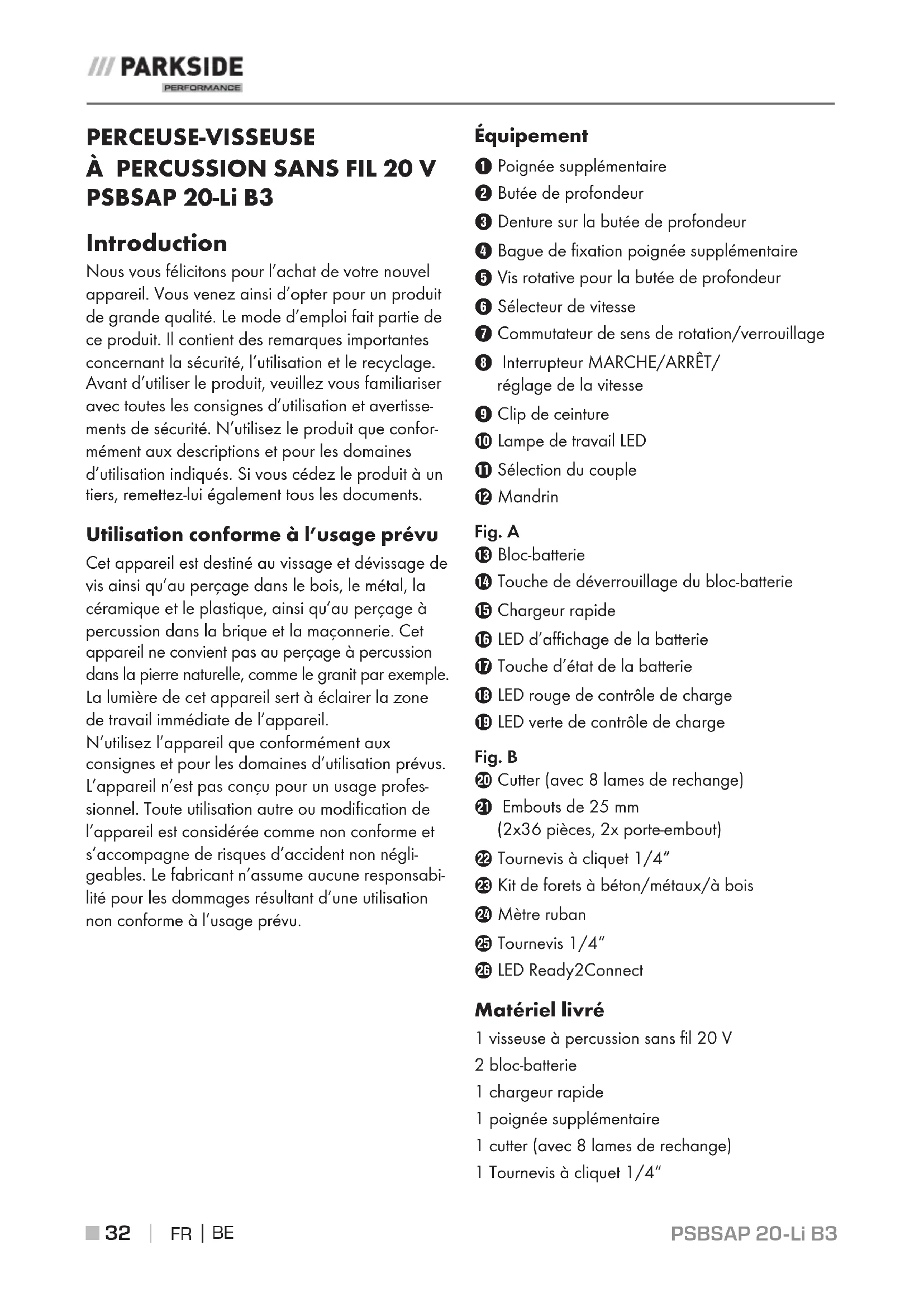 PSBSAP 20-Li B3 Introduction Nous vous félicitons pour l’achat de votre nouvel appareil. Vous venez ainsi d’opter pour un produit de grande qualité. Le mode d’emploi fait partie de ce produit. Il contient des remarques importantes concernant la sécurité, l’utilisation et le recyclage. Avant d’utiliser le produit, veuillez vous familiariser avec toutes les consignes d’utilisation et avertisse- ments de sécurité. N’utilisez le produit que confor- mément aux descriptions et pour les domaines d’utilisation indiqués. Si vous cédez le produit à un tiers, remettez-lui également tous les documents. Utilisation conforme à l’usage prévu Cet appareil est destiné au vissage et dévissage de vis ainsi qu’au perçage dans le bois, le métal, la céramique et le plastique, ainsi qu’au perçage à percussion dans la brique et la maçonnerie. Cet appareil ne convient pas au perçage à percussion dans la pierre naturelle, comme le granit par exemple. La lumière de cet appareil sert à éclairer la zone de travail immédiate de l’appareil. N’utilisez l’appareil que conformément aux consignes et pour les domaines d’utilisation prévus. L’appareil n’est pas conçu pour un usage profes- sionnel. Toute utilisation autre ou modification de l’appareil est considérée comme non conforme et s’accompagne de risques d’accident non négli- geables. Le fabricant n’assume aucune responsabi- lité pour les dommages résultant d’une utilisation non conforme à l’usage prévu. Équipement 1 Poignée supplémentaire 2 Butée de profondeur 3 Denture sur la butée de profondeur 4 Bague de fixation poignée supplémentaire 5 Vis rotative pour la butée de profondeur 6 Sélecteur de vitesse 7 Commutateur de sens de rotation/verrouillage 8 Interrupteur MARCHE/ARRÊT/ réglage de la vitesse 9 Clip de ceinture 0 Lampe de travail LED q Sélection du couple w Mandrin Fig. A e Bloc-batterie r Touche de déverrouillage du bloc-batterie t Chargeur rapide z LED d’affichage de la batterie u Touche d’état de la batterie i LED rouge de contrôle de charge o LED verte de contrôle de charge Fig. B p Cutter (avec 8 lames de rechange) a Embouts de 25 mm (2x36 pièces, 2x porte-embout) s Tournevis à cliquet 1/4“ d Kit de forets à béton/métaux/à bois f Mètre ruban g Tournevis 1/4“ h LED Ready2Connect Matériel livré 1 visseuse à percussion sans fil 20 V 2 bloc-batterie 1 chargeur rapide 1 poignée supplémentaire 1 cutter (avec 8 lames de rechange) 1 Tournevis à cliquet 1/4“PSBSAP 20-Li B3