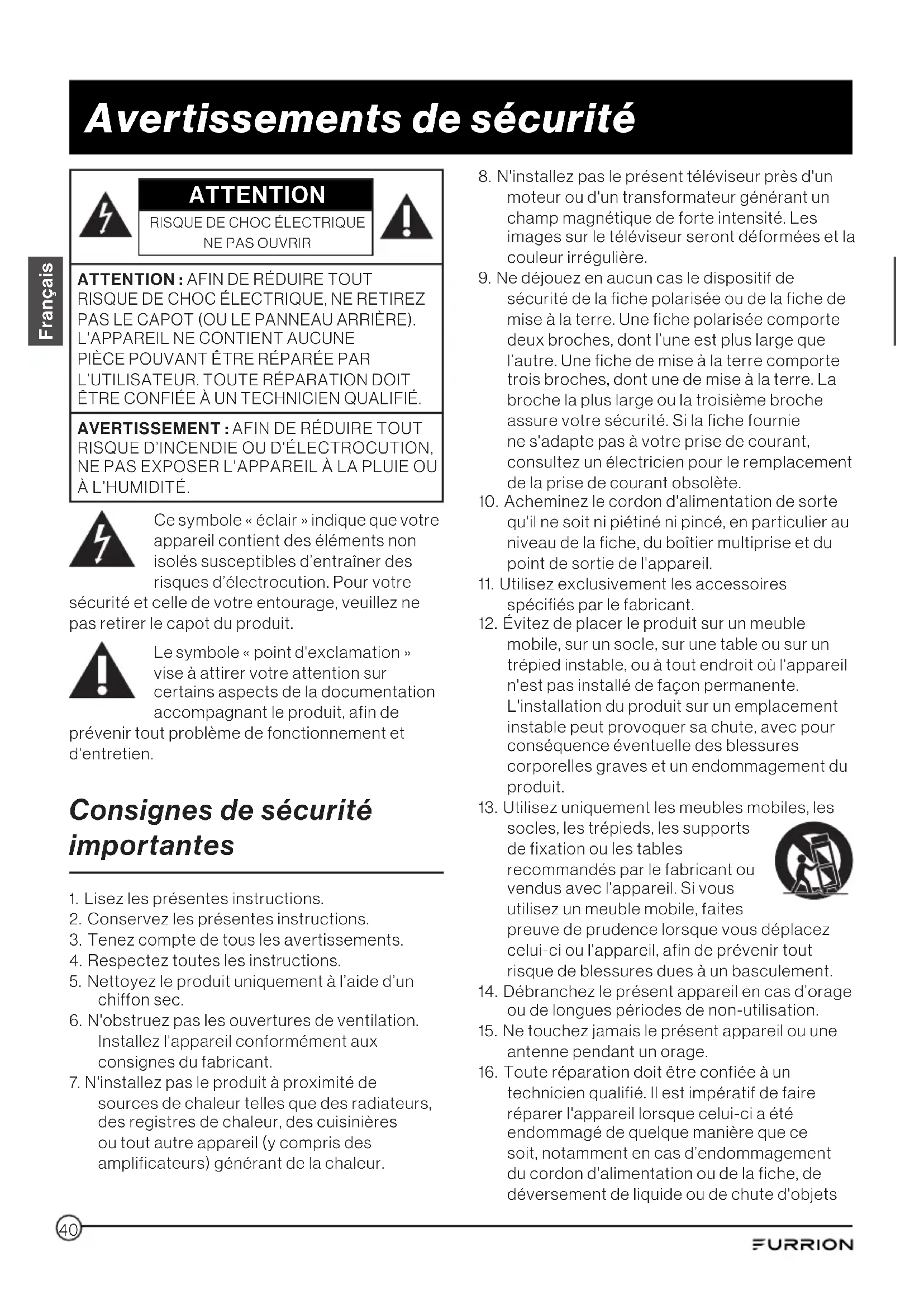 téléviseur, car vous pourriez être exposé(e) à de très hautes tensions et à d'autres dangers. Si le téléviseur ne fonctionne pas correctement, débranchez-le et contactez votre revendeur agréé ou le centre de service technique. Réglez uniquement les commandes spécifiées dans les instructions. Tout changement ou toute modification incorrect(e) non expressément approuvé(e) par Furrion peut entraîner l'annulation de la garantie.
