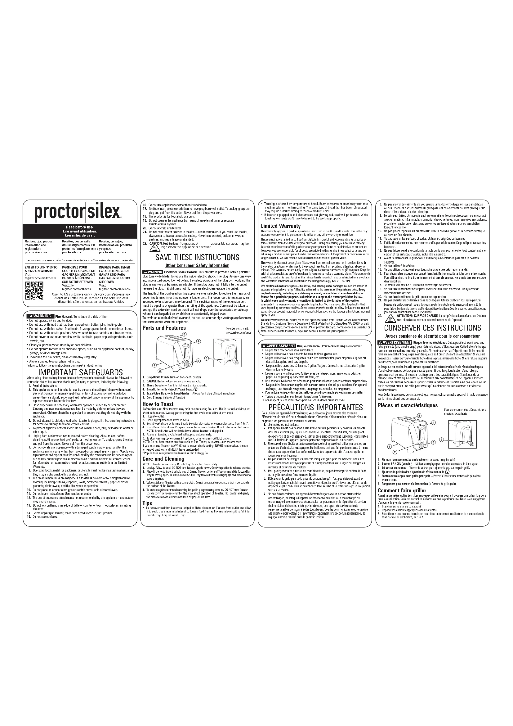 - Pour déloger les aliments coincés dans les fentes, débrancher le grille-pain de la prise de courant et laisser refroidir. Utiliser un ustensile non métallique pour déloger l’aliment des éléments et le laisser tomber dans le plateau ramasse-miettes. Vider le plateau ramasse-miettes.• Le grillage est affecté par la température du pain. Le pain à la température ambiante peut griller à une nuance moyenne au réglage moyen. Le même genre de pain réfrigéré peut nécessiter un réglage plus foncé pour atteindre une nuance moyenne.• Si le grille-pain est branché et que les éléments ne deviennent pas rouges, les aliments grilleront. Pendant le grillage, les éléments ne devenant pas rouges n’indiquent pas un mauvais fonctionnement. Garantie limitée Cette garantie s’applique aux produits achetés et utilisées aux É.-U. et au Canada. C’est la seule garantie expresse pour ce produit et est en lieu et place de tout autre garantie ou condition. Ce produit est garanti contre tout défaut de matériaux et de main-d’oeuvre pour une période de trois (3) ans à compter de la date d’achat d’origine. Au cours de cette période, votre recours exclusif se limitera au remplacement de ce produit ou tout autre composant défectueux, à notre discrétion. Cependant, vous êtes responsables des frais associés au retour du produit ou d’un composant en vertu de la présente garantie. Si le produit ou le composant est non disponible, nous le remplacerons avec un article similaire de valeur égale ou supérieure.Cette garantie ne couvre pas le verre, les filtres, l’usure d’un usage normal, l’utilisation non conforme aux directives imprimées, ou des dommages au produit résultant d’un accident, modification, utilisation abusive ou incorrecte. Cette garantie s’applique seulement à l’acheteur original ou à la personne l’ayant reçu en cadeau. La présentation du reçu de vente d’origine comme preuve d’achat est nécessaire pour faire une réclamation au titre de cette garantie. Cette garantie s’annule si le produit est utilisé autrement que par une famille ou si l’appareil est soumis à toute tension ou forme d’onde différente des caractéristiques nominales précisées sur l’étiquette (par ex. : 120 V ~ 60 Hz).Nous excluons toutes les réclamations au titre de cette garantie pour les dommages spéciaux, consécutifs et indirects causés par la violation de garantie expresse ou implicite. Toute responsabilité est limitée au prix d’achat. Chaque garantie implicite, y compris toute garantie ou condition de qualité marchande ou d’adéquation à un usage particulier, est exonérée, sauf dans la mesure interdite par la loi, auquel cas la garantie ou condition est limitée à la durée de cette garantie écrite. Cette garantie vous donne des droits légaux précis. Vous pouvez avoir d’autres droits qui varient selon l’endroit où vous habitez. Certaines provinces ne permettent pas les limitations sur les garanties implicites ou les dommages spéciaux ou indirects de telle sorte que les limitations ci-dessus ne s’appliquent peut-être pas à votre cas.Pour faire une réclamation au titre de la garantie, veuillez ne pas retourner cet appareil au magasin. Veuillez nous écrire à Hamilton Beach Brands, Inc., Customer Service Department, 4421 Waterfront Dr., Glen Allen, VA 23060, ou visiter le site proctorsilex.com/customer-service aux États-Unis ou proctorsilex.ca/customer-service au Canada. Pour obtenir un service plus rapide, veuillez repérer les numéros de modèle, de type et de séries sur votre appareil.w ADVERTENCIA Riesgo de incendio: Para reducir el riesgo de incendio: