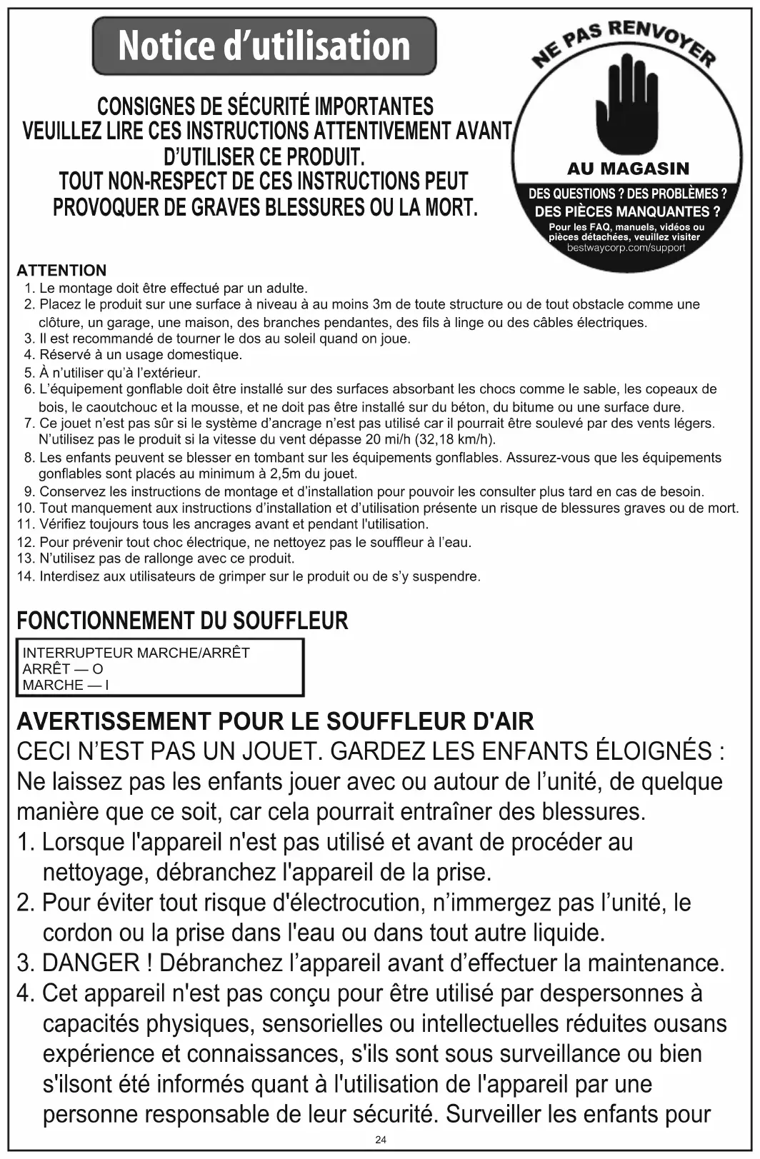 DES QUESTIONS ? DES PROBLÈMES ? DES PIÈCES MANQUANTES ? Pour les FAQ, manuels, vidéos oupièces détachées, veuillez visiter bestwaycorp.com/support AU MAGASIN Notice d’utilisationAVERTISSEMENT POUR LE SOUFFLEUR D'AIR CECI N’EST PAS UN JOUET. GARDEZ LES ENFANTS ÉLOIGNÉS : Ne laissez pas les enfants jouer avec ou autour de l’unité, de quelque manière que ce soit, car cela pourrait entraîner des blessures.
