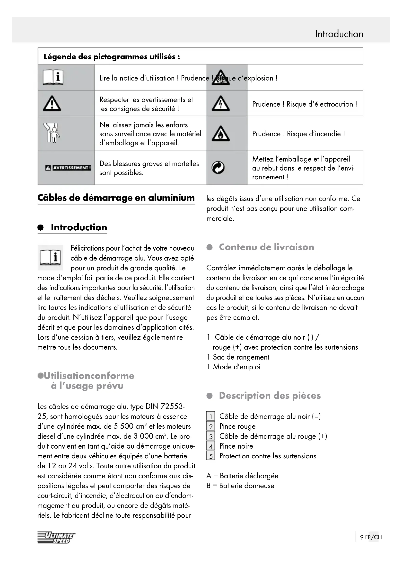 PLOSION ! Ne pas utiliser le câble de démarrage alu dans un environne- ment explosif contenant des vapeurs, gaz ou poussières inflammables. Conserver ce mode d’emploi en vue d’une utili- sation ultérieure. Si vous transmettez le produit à un tiers, délivrez également le mode d’emploi. Danger de mort par électrocution Avant chaque utilisation, contrôler le bon état du câble de démarrage alu. Ne jamais utiliser le câble de démarrage alu si vous détectez le moindre endommagement. ATTENTION ! Les câbles défectueux repré- sentent un risque mortel d’électrocution. En cas d’endommagements, de réparations ou d’autres problèmes, veuillez contacter la filiale S.A.V. ou un électricien. Ne jamais ouvrir l’un des composants (câbles) électriques, ni insérer un objet dans ceux-ci. Ce type d’intervention représente un danger mortel d’électrocution. Consignes de sécurité relatives au câble de démarrage alu La capacité de la batterie donneuse, par ex. 45 Ah, (véhicule B) ne doit pas être considéra- blement inférieure à celle de la batterie en panne (véhiculeA), sinon le véhicule ne pourra démar- rer. Il existe un risque de surchauffe. Seules des batteries de tension nominale iden- tique (12 ou 24volts) peuvent être reliées avec le câble de démarrage alu. Dans le cas contraire, il existe un risque de court-circuit et d’endom- magement de l’électronique de bord ainsi que des composants électriques. Les carrosseries des véhicules (véhicule A et B) ne doivent pas être en contact. Dans le cas contraire, il existe un risque de court-circuit.11 FR/CH Sécurité / Utilisation des câbles de démarrage alu RISQUE D’INCENDIE! Tenir toute source d’inflammation (par ex. éclairage ouvert, cigares et cigarettes allumé(e) s ou étincelles électriques) à distance des batteries. PRUDENCE! RISQUES DE BLESSURES! RISQUE DE BLESSURES DES YEUX! Ne pas se pencher au-dessus des batteries. L’élec- trolyte est liquide, même à basses températures et indépendamment du niveau de charge. La batterie déchargée (véhiculeA) ne doit pas être déconnectée de son réseau de bord lors du démarrage assisté. Avant de connecter le câble de démarrage alu, il convient de couper l’allumage des véhicules et de serrer le frein à main. Si la boîte de vitesses est manuelle, mettez le levier en position neutre; si la boîte est automatique, sur «P». Placez les câbles de démarrage alu de manière à ce qu’ils ne puissent pas être happés par des pièces en rotation dans la zone du moteur. Utilisation du câble de démarrage alu Connecter Remarque: commencez par vérifier que les deux batteries, à savoir la batterie donneuse (véhicule B) et la batterie déchargée (véhiculeA), ont une tension identique (12 ou 24volts) et une capacité quasiment identique. Comparez les inscriptions sur les batteries! RISQUE D’EXPLOSION ! Il ne faut en aucun cas connecter le pôle négatif de la batterie déchargée en raison du risque de formation d’étincelles pou- vant enflammer des gaz explosifs.