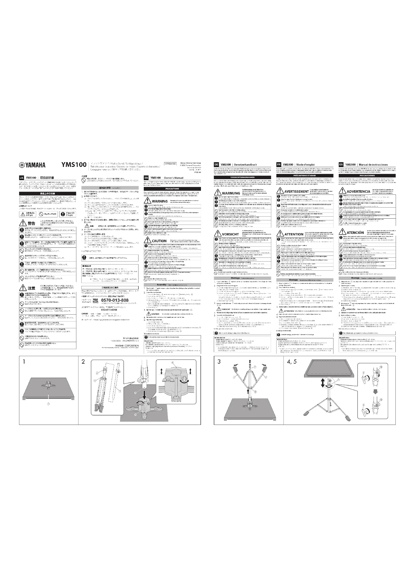 YMS100 | Mode d’emploi Nous vous remercions d’avoir choisi la tablette pour baguettes YMS100 de Yamaha. Lisez attentivement ce mode d’emploi avant d’utiliser ce produit an de garantir une utilisation sûre et durable. Après avoir lu ce mode d’emploi, conservez-le dans un lieu sûr et à portée de main pour toute référence ultérieure.PRÉCAUTIONS D’USAGEVeuillez lire les instructions d’utilisation et de manipulation suivantes avant d’utiliser la tablette pour baguettes. Pour votre sécurité, respectez les précautions suivantes relatives à l’emplacement et à l’utilisation de ce produit au quotidien. Tout spécialement dans le cas d’une utilisation par un enfant, un adulte doit au préalable lui expliquer comment manipuler et utiliser la tablette pour baguettes. AVERTISSEMENT Si vous négligez les avertissements signalés par ce symbole, il peut se produire des blessures graves ou mortelles.Placez la tablette sur une surface stable et plane.Si le sol est en pente, la tablette risque de basculer et de tomber, causant des blessures.Serrez fermement les vis de fixation aux deux emplacement. Si les vis se dévissaient pendant l’utilisation et que la tablette venait à tomber ou se renverser, cela pourrait entraîner des blessures.Vissez l’extrémité filetée du tube d’assemblage sur la pince au dessous de la tablette et bloquez-le solidement.Si le tube n’est pas correctement fixé, la tablette peut se renverser ou tomber, causant des blessures.Ne jouez pas à proximité de la tablette pour baguettes.Si vous heurtez votre tête ou votre visage sur la tablette, cela pourrait causer des blessures.Ne restez pas près de la tablette pour baguettes pendant un tremblement de terre.Elle peut se renverser en cas de forte secousse, causant des blessures.Vérifiez que l’ouverture des pieds assure une stabilité optimale de la tablette.La tablette pourrait se renverser et causer des blessures si les pieds sont instables.Ne dévissez pas soudainement les vis de fixation lors du réglage de hauteur de la tablette.Vous pourriez vous blesser les mains ou les doigts si le tube ou la tablette venait à glisser.N’utilisez pas la tablette comme un jouet.Elle pourrait se renverser ou tomber, causant des blessures. ATTENTION Le non-respect des consignes repérées par ce symbole et l’utilisation incorrecte du produit peuvent entraîner des blessures ou la perte de biens personnels.Montez l’instrument dans l’ordre séquentiel correct, en suivant les instructions de montage dans ce manuel. Veillez en outre à serrer régulièrement les vis ou écrous. Ignorer cette consigne pourrait causer l’endommagement de l’instrument ou sa chute, entraînant d’éventuelles blessures.Ne placez pas d’objets de plus de 1 kg sur la tablette.La tablette risquerait alors de se renverser.Ne placez pas les objets à un seul emplacement sur la tablette.Une répartition inégale du poids peut causer le renversement de la tablette.N’ajustez pas la hauteur de la tablette avec des objets placés dessus.Les objets pourraient bouger et tomber de la tablette, entraînant des blessures.Faites attention à ne pas vous pincer les doigts lors de l’ouverture ou la fermeture des pieds.Les parties mobiles des pieds peuvent causer des blessures aux doigts.Faites attention de ne pas vous blesser sur les surfaces intérieures et extérieures du tube.Leurs bords rugueux peuvent causer des blessures.Utilisez exclusivement les vis incluses avec les accessoires fournis.Sinon, la tablette risque de basculer et de tomber, causant des blessures.Placez uniquement des instruments de percussion sur cette tablette.Sinon, la tablette risque de basculer et de tomber, causant des blessures. AVIS N’utilisez jamais de diluant ni de benzène pour nettoyer la tablette.Cela pourrait décolorer la finition. Essuyez la tablette pour baguettes avec un chiffon doux et sec.Montage * Reportez-vous à l’illustration ci-dessous Placez la tablette à l’envers sur un morceau de carton ou une couverture sur le sol pour la protéger des rayures. Fixez la tablette sur son stand.(1) Desserrez la vis de fixation de la tablette, puis insérez le tube supérieur dans l’orifice au centre de l’ensemble des pieds