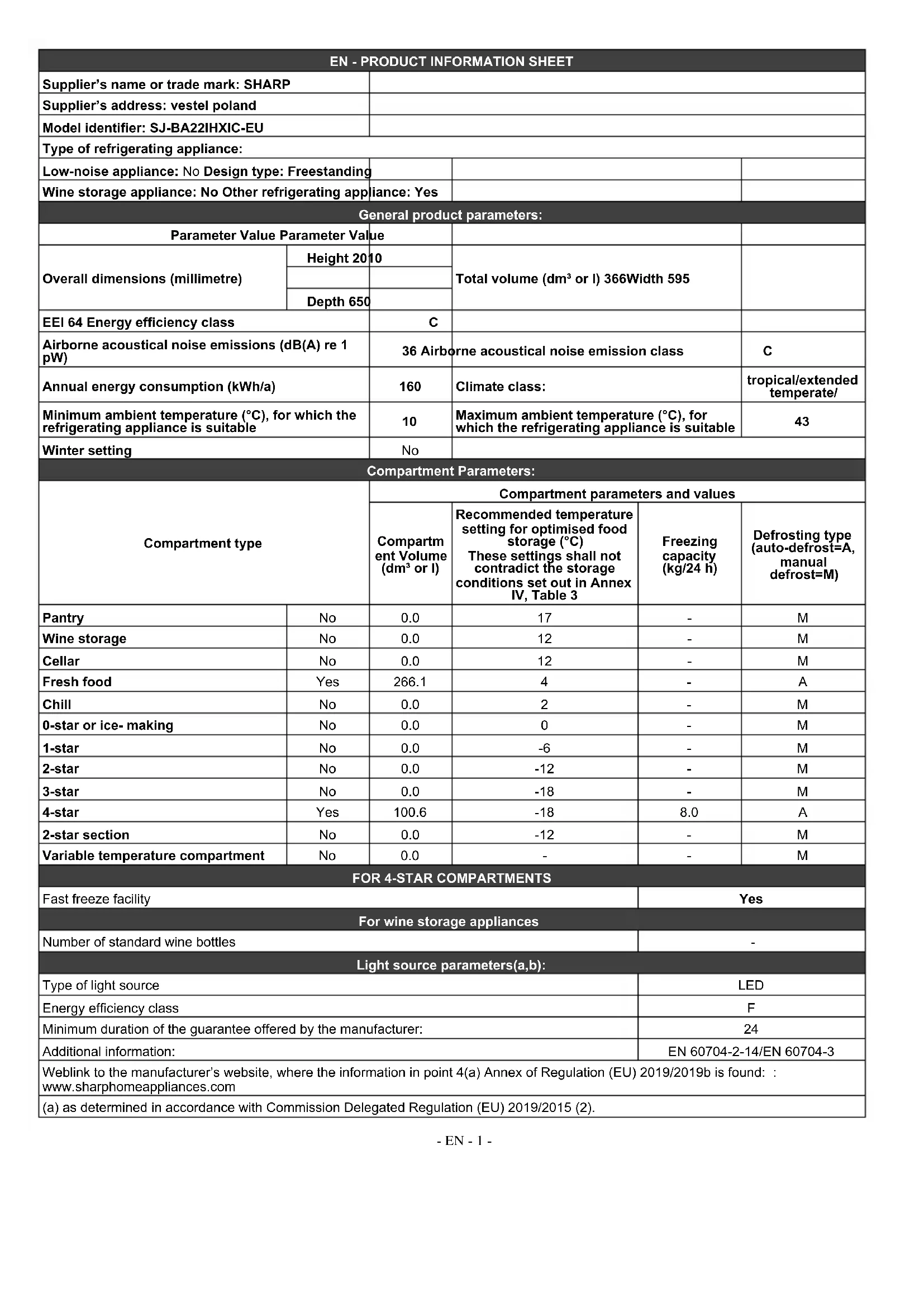 Fast freeze facility Yes For wine storage appliances Number of standard wine bottles - Light source parameters(a,b): Type of light source LED Energy efficiency class F Minimum duration of the guarantee offered by the manufacturer: 24 Additional information: EN 60704-2-14/EN 60704-3 Weblink to the manufacturer’s website, where the information in point 4(a) Annex of Regulation (EU) 2019/2019b is found: : www.sharphomeappliances.com (a) as determined in accordance with Commission Delegated Regulation (EU) 2019/2015 (2). - EN - 1 -FR - FICHE D’INFORMATIONS SUR LE PRODUIT Nom ou marque du fournisseur : SHARP Adresse du fournisseur : vestel poland Identifiant du modèle : SJ-BA22IHXIC-EU Type d'appareil frigorifique : Appareil silencieux : Non Type de conception : Réfrigérateur Appareil pour le stockage du vin : Non Autre appareil frigorifique : Oui Paramètres généraux du produit : Paramètre Valeur Paramètre Valeur Dimensions générales (millimètre) Hauteur 2010 Volume total (dm³ ou l) 366Largeur 595 Profondeur 650 EEI 64 Classe d'efficacité énergétique : C Émissions de bruit acoustique aérien (dB (A) re 1 pW)