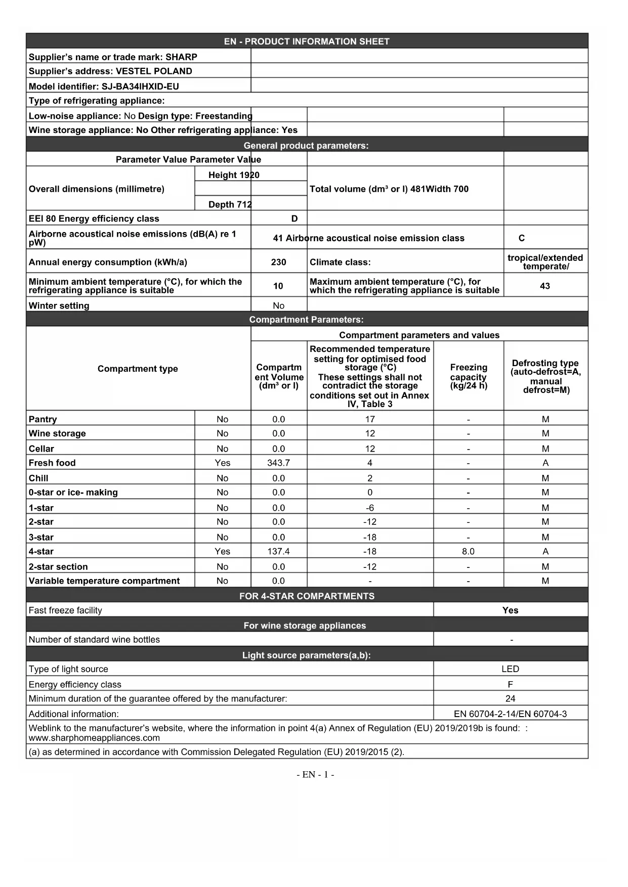 Fast freeze facility Yes For wine storage appliances Number of standard wine bottles - Light source parameters(a,b): Type of light source LED Energy efficiency class F Minimum duration of the guarantee offered by the manufacturer: 24 Additional information: EN 60704-2-14/EN 60704-3 Weblink to the manufacturer’s website, where the information in point 4(a) Annex of Regulation (EU) 2019/2019b is found: : www.sharphomeappliances.com (a) as determined in accordance with Commission Delegated Regulation (EU) 2019/2015 (2). - EN - 1 -FR - FICHE D’INFORMATIONS SUR LE PRODUIT Nom ou marque du fournisseur : SHARP Adresse du fournisseur : VESTEL POLAND Identifiant du modèle : SJ-BA34IHXID-EU Type d'appareil frigorifique : Appareil silencieux : Non Type de conception : Réfrigérateur Appareil pour le stockage du vin : Non Autre appareil frigorifique : Oui Paramètres généraux du produit : Paramètre Valeur Paramètre Valeur Dimensions générales (millimètre) Hauteur 1920 Volume total (dm³ ou l) 481Largeur 700 Profondeur 712 EEI 80 Classe d'efficacité énergétique : D Émissions de bruit acoustique aérien (dB (A) re 1 pW)