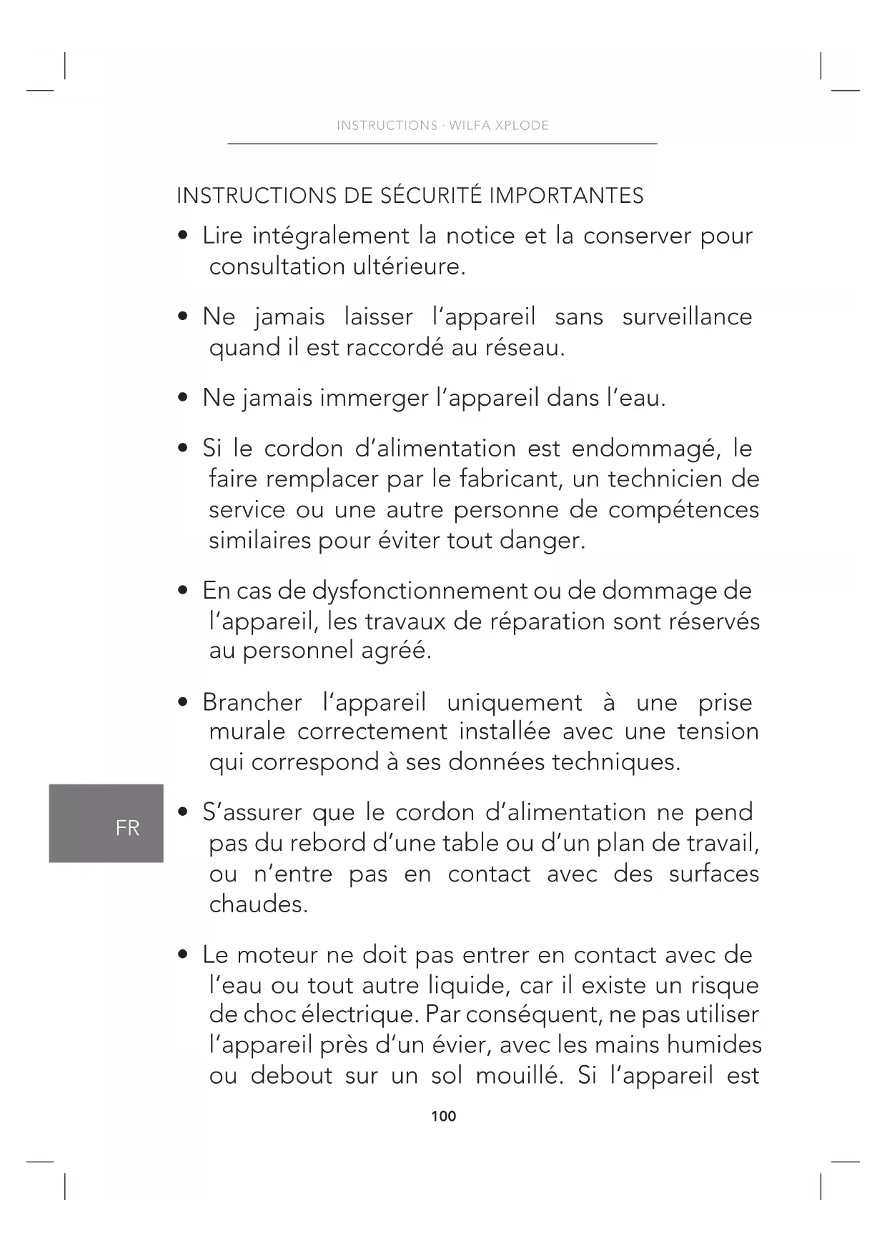 220 V~ 240 V~50 Hz, 1800 W ASSISTANCE ET PIÈCES DÉTACHÉES Pour toute demande d’assistance, consulter le site wilfa.com et la page de notre service client/d’assistance. Cette page propose des réponses aux questions les plus fréquentes, des informations sur les pièces détachées, des conseils et astuces ainsi que toutes nos coordonnées. RECYCLAGE Ce marquage indique que l’élimination de ce produit avec les déchets ménagers est proscrite dans toute l’Union européenne. Pour éviter tout impact négatif sur l’environnement ou la santé humaine en raison d’une élimination inadéquate des déchets, recycler l’appareil de manière responsable, an d’encourager la réutilisation durable des ressources matérielles. Pour retourner l’appareil usagé, recourir aux systèmes de retour et de collecte, ou contacter le revendeur auprès duquel le produit a été acheté. Celui-ci pourra reprendre le produit pour un recyclage gratuit, respectueux de l’environnement.110
