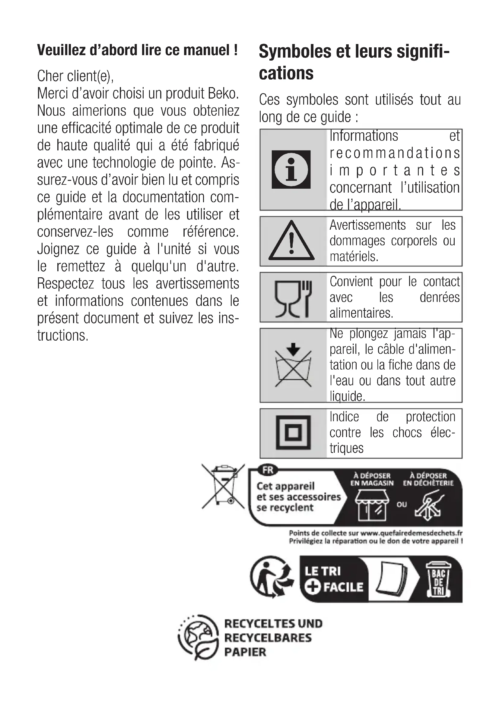 Diese Garantiezusage ist nur gültig innerhalb der Bundesrepublik Deutschland Garantiebedingungen - Beko – Version Februar 2021Veuillez d’abord lire ce manuel ! Cher client(e), Merci d’avoir choisi un produit Beko. Nous aimerions que vous obteniez une efficacité optimale de ce produit de haute qualité qui a été fabriqué avec une technologie de pointe. As- surez-vous d’avoir bien lu et compris ce guide et la documentation com- plémentaire avant de les utiliser et conservez-les comme référence. Joignez ce guide à l'unité si vous le remettez à quelqu'un d'autre. Respectez tous les avertissements et informations contenues dans le présent document et suivez les ins- tructions. Symboles et leurs signifi- cations Ces symboles sont utilisés tout au long de ce guide :