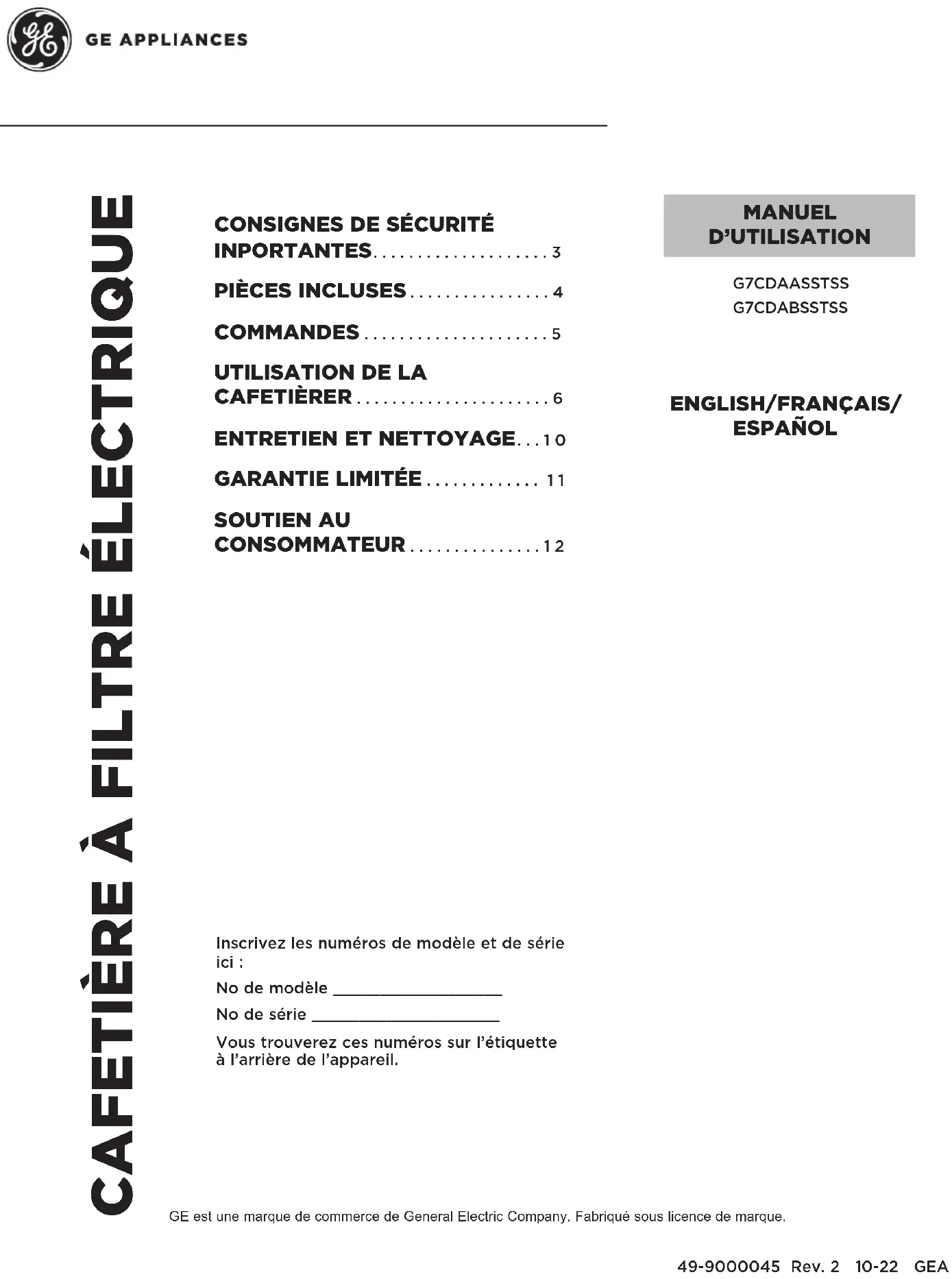 Votre seul recours exclusif consiste en l'échange du produit ou son remboursement en vertu de cette garantie limitée. Toute garantie implicite, y compris les garanties implicites relatives à la qualité marchande ou à l’adéquation à un usage particulier, se limitera à une période de un (1) an ou à la période la plus courte prescrite par la loi. Pour la vente dans les 50 États et le district de Columbia des États-Unis seulement : Clients des États-Unis : Cette garantie limitée est étendue à l’acheteur d’origine pour les produits achetés relativement à une utilisation domestique à l’intérieur des États-Unis. Certains États ou provinces ne permettent pas l'exclusion ou la restriction des dommages accessoires ou indirects. Certains droits particuliers vous sont dévolus en vertu de la présente garantie et peuvent s'accompagner d'autres droits qui varient selon votre lieu de résidence. Pour connaître la nature exacte de vos droits, consultez l’organisme de protection du consommateur de votre région, ou encore le bureau du procureur général de l’État. Garant : GE Appliances, une compagnie Haier Louisville, KY 40225 Pour les clients au Canada: Cette garantie limitée est étendue à l'acheteur original et à tout propriétaire suivant pour les produits achetés au Canada pour un usage domestique au Canada. Le service de mandat à domicile sera fourni dans les zones où il est disponible et jugé raisonnable par Mabe. Garant Canada: MC Commercial, Burlington, Ontario, L7R 5B612 49-9000045 Rev. 2 Soutien au consommateur Service et enregistrement Enregistrez votre nouvel électroménager en ligne à votre convenance! L’enregistrement de votre produit dans les plus brefs délais permet une meilleure communication et un service rapide en vertu de votre garantie, le cas échéant. Enregistrez votre électroménager sur GEAppliances.com/register. Communiquez avec nous Si vous n’êtes pas satisfait du service reçu de GE Appliances, contactez-nous via notre site Web avec tous les détails, y compris votre numéro de téléphone, ou encore écrivez à : Aux États-Unis : General Manager, Customer Relations | GE Appliances, Appliance Park | Louisville, KY 40225 GEAppliances.com/contact Au Canada : Directeur, Relations avec le consommateur, Mabe Canada Inc. | Suite 310, 1 Factory Lane | Moncton, N.B. E1C 9M3 GEAppliances.ca/en/contact-usCAFETERA DE FILTRO 49-9000045 Rev. 2 10-22 GEA G7CDAASSTSS G7CDABSSTSS