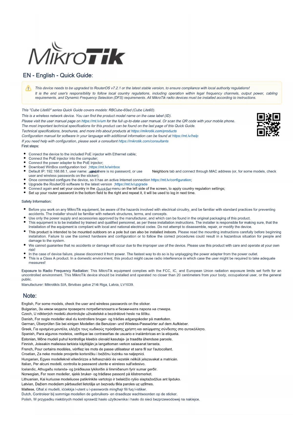 Il s'agit d'un périphérique réseau sans fil. Vous pouvez trouver le nom du modèle du produit sur l'étiquette du boîtier (ID). Veuillez visiter la page du manuel d'utilisation sur pour le manuel d'utilisation complet et à jour.https://mt.lv/um-fr Ou scannez le code QR avec votre téléphone portable. Les spécifications techniques les plus importantes de ce produit se trouvent sur la dernière page de ce guide rapide. Spécifications techniques, brochures et plus d'informations sur les produits surhttps://mikrotik.com/products Vous trouverez le manuel de configuration du logiciel dans votre langue avec des informations supplémentaires sur https://mt.lv/help-fr Si vous avez besoin d'aide pour la configuration, veuillez consulter un consultant https://mikrotik.com/consultants Premiers pas: Connectez l'appareil à l'injecteur PoE fourni avec un câble Ethernet; Connectez l'injecteur PoE à l'ordinateur; Connectez l'adaptateur d'alimentation à l'injecteur PoE; Téléchargez l'outil de configuration WinBox ;https://mt.lv/winbox IP par défaut: 192.168.88.1, nom d'utilisateur: et il n'y a pas de mot de passe, ou utilisez l' admin onglet Neighbors et connectez-vous via l'adresse MAC; Une fois connecté, configurez l'appareil pour qu'il dispose d'une connexion Internet active ;https://mt.lv/configuration-fr Mettez à niveau le logiciel RouterOS vers la dernière version ;https://mt.lv/upgrade-fr Connectez-vous à nouveau et définissez votre pays dans le sur le côté gauche de l'écran, pour appliquer les paramètres de réglementation du menu QuickSet pays; Configurez le mot de passe de votre routeur dans le champ en bas à droite et répétez-le, il sera utilisé pour vous connecter la prochaine fois. Information sur la sécurité: Avant de travailler sur un équipement MikroTik, soyez conscient des dangers liés aux circuits électriques et familiarisez-vous avec les pratiques standard de prévention des accidents. Le programme d'installation doit être familiarisé avec les structures, les termes et les concepts du réseau. Utilisez uniquement l'alimentation et les accessoires approuvés par le fabricant et qui se trouvent dans l'emballage d'origine de ce produit. Cet équipement doit être installé par du personnel formé et qualifié, conformément à ces instructions d'installation. L'installateur est responsable de s'assurer que l'installation de l'équipement est conforme aux codes électriques locaux et nationaux. N'essayez pas de démonter, réparer ou modifier l'appareil. Ce produit est destiné à être monté à l'extérieur sur un poteau, mais peut également être installé à l'intérieur. Veuillez lire attentivement les instructions de montage avant de commencer l'installation. Ne pas utiliser le correc matériel t et de configuration ou de suivre les procédures appropriées pourrait entraîner .une situation dangereuse pour les personnes et les dommages aux systè m Nous ne pouvons garantir qu'aucun accident ou dommage ne se produira en raison d'une mauvaise utilisation de l'appareil. Veuillez utiliser ce produit avec soin et l'utiliser à vos propres risques! En cas de panne de l'appareil, veuillez le déconnecter de l'alimentation. La façon la plus rapide de le faire est de débrancher l'adaptateur secteur de la prise de courant. Ceci est un produit de classe A. Dans un environnement domestique, ce produit peut provoquer des interférences radio, auquel cas l'utilisateur peut être amené à prendre des mesures adéquates! Cet appareil doit être mis à niveau vers RouterOS v7.2.1 ou la dernière version stable, pour garantir la conformité aux réglementations des autorités locales! Il incombe aux utilisateurs finaux de suivre les réglementations locales du pays, y compris le fonctionnement dans les canaux de fréquence légaux, la puissance de sortie, les exigences de câblage et les exigences de sélection dynamique de fréquence (DFS). Tous les appareils radio MikroTik doivent être installés conformément aux instructions.cet équipement MikroTik est conforme aux limites d'exposition aux rayonnements FCC, IC et Union européenneExposition aux rayonnements radiofréquences: établies pour un environnement non contrôlé. Cet appareil MikroTik doit être installé et utilisé à au moins 20 centimètres de votre corps, de l'utilisateur professionnel ou du grand public. Fabricant: Mikrotikls SIA, Brivibas gatve 214i Riga, Lettonie, LV1039. HR - Hrvatski. Brzi vodič: Ovaj kratki vodič serije "Cube Lite60" obuhvaća modele: RBCube-60ad (Cube Lite60).