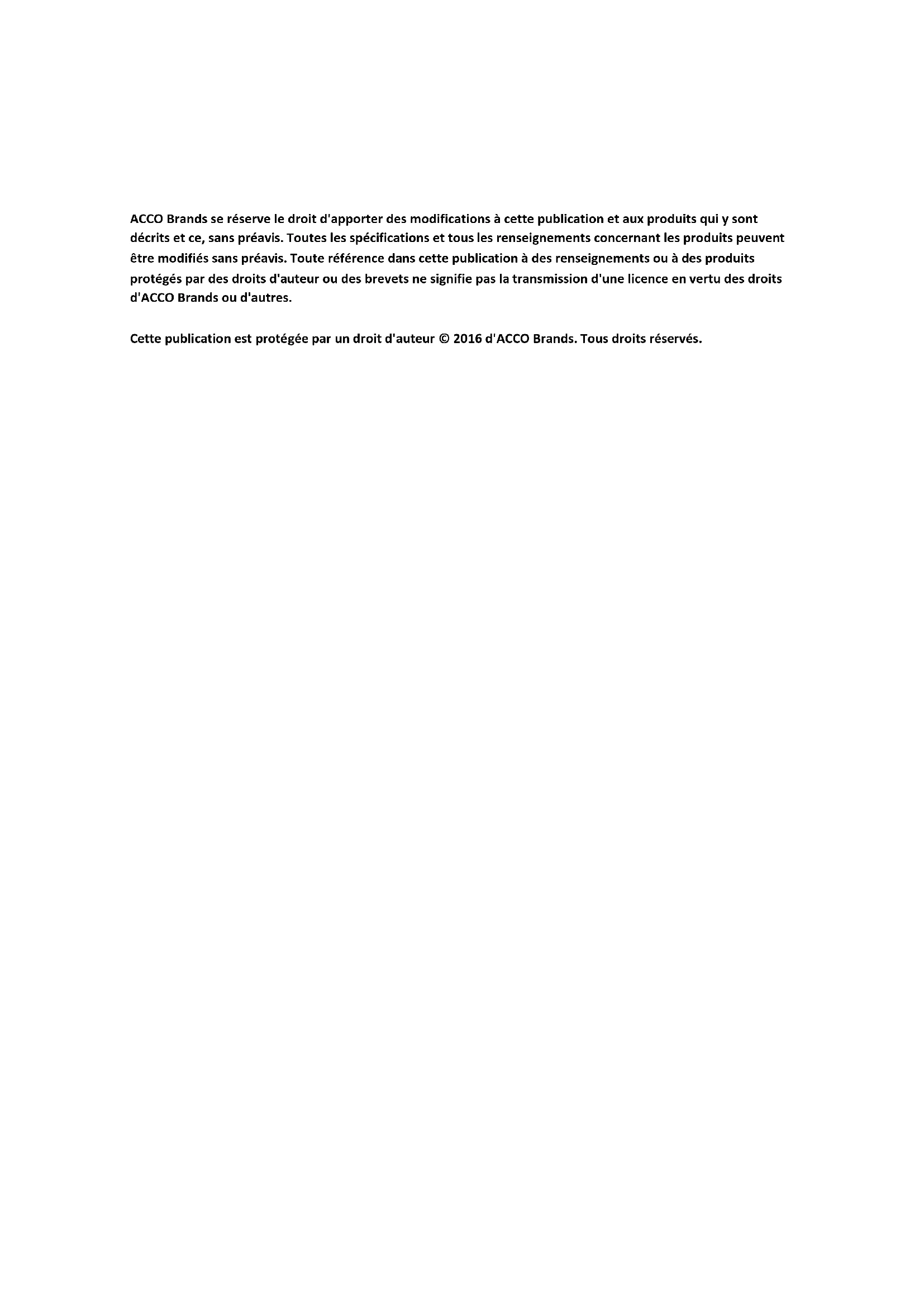 ACCOBrandsseréserveledroitd'apporterdesmodificationsàcettepublicationetauxproduitsquiysont décritsetce,sanspréavis.Touteslesspécificationsettouslesrenseignementsconcernantlesproduitspeuvent êtremodifiéssanspréavis.Touteréférencedanscettepublicationàdesrenseignementsouàdesproduits protégéspardesdroitsd'auteuroudesbrevetsnesignifiepaslatransmissiond'unelicenceenvertudesdroits d'ACCOBrandsoud'autres.