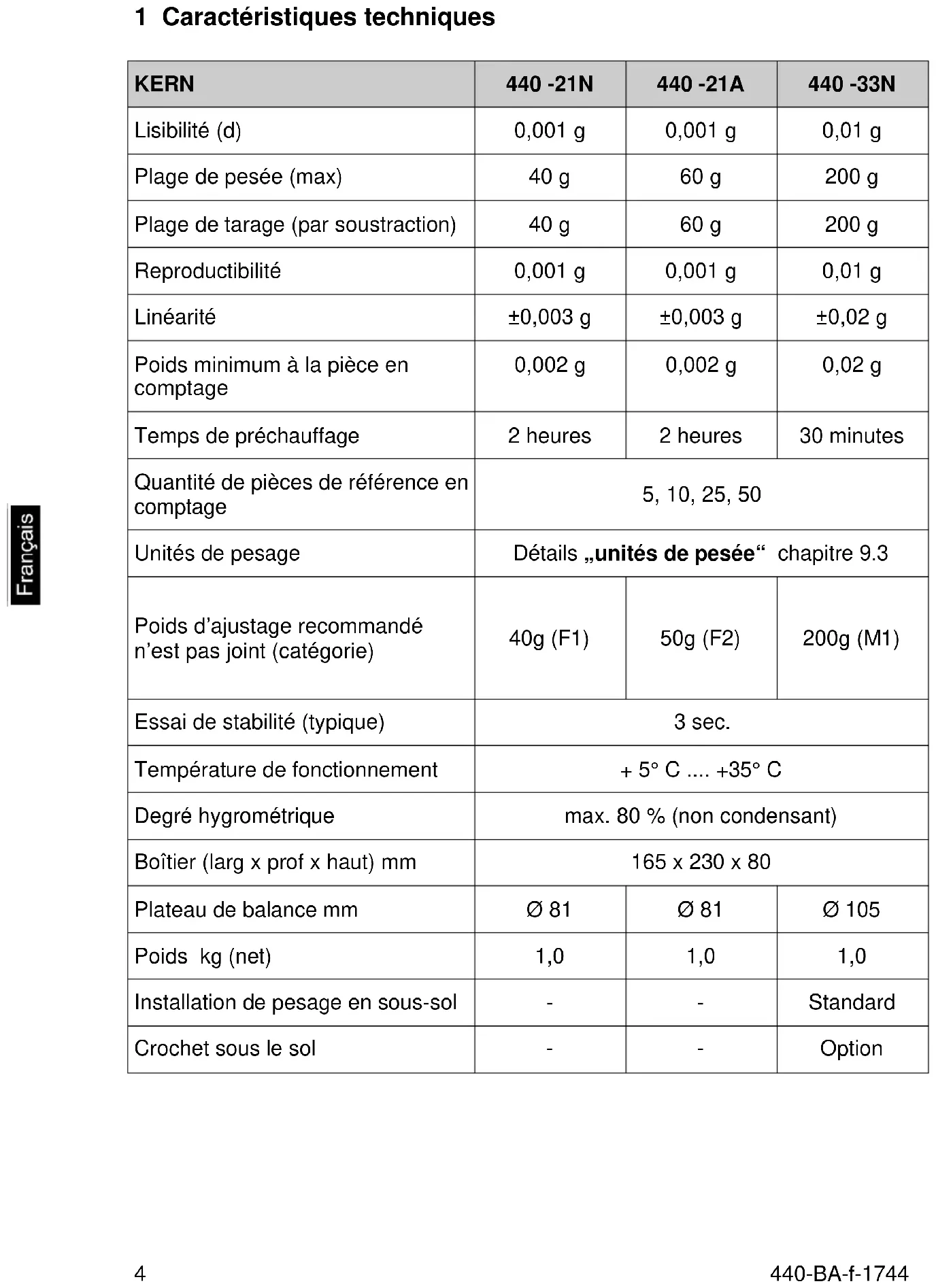 KERN 440 -35N 440 -35A 440 -43N 440 -45N Lisibilité (d) 0,01 g 0,01 g 0,1 g 0,1 g Plage de pesée (max) 400 g 600 g 400 g 1 000 g Plage de tarage (par soustraction) 400 g 600 g 400 g 1 000 g Reproductibilité 0,01 g 0,01 g 0,1 g 0,1 g Linéarité ±0,03 g ±0,03 g ±0,2 g ±0,2 g Poids minimum à la pièce en comptage 0,02 g 0,02 g 0,2 g 0,2 g Temps de préchauffage 2 heures 2 heures 10 minutes 30 minutes Quantité de pièces de référence en comptage 5, 10, 25, 50 Unités de pesage Détails „unités de pesée“ chapitre 9.3 Poids d’ajustage recommandé n’est pas joint (catégorie) 400g (F2) 500g (F2) 400 g (M2) 1 000 g (M1) Essai de stabilité (typique) 3 sec. Température de fonctionnement + 5° C .... +35° C Degré hygrométrique max. 80 % (non condensant) Boîtier (larg x prof x haut) mm 165 x 230 x 80 Plateau de balance mm Ø 105 Ø 105 130 x 130 130 x 130 Poids kg (net) 1,0 1,0 1,0 1,0 Installation de pesage en sous- sol Standard Crochet sous le sol Option440-BA-f-1744
