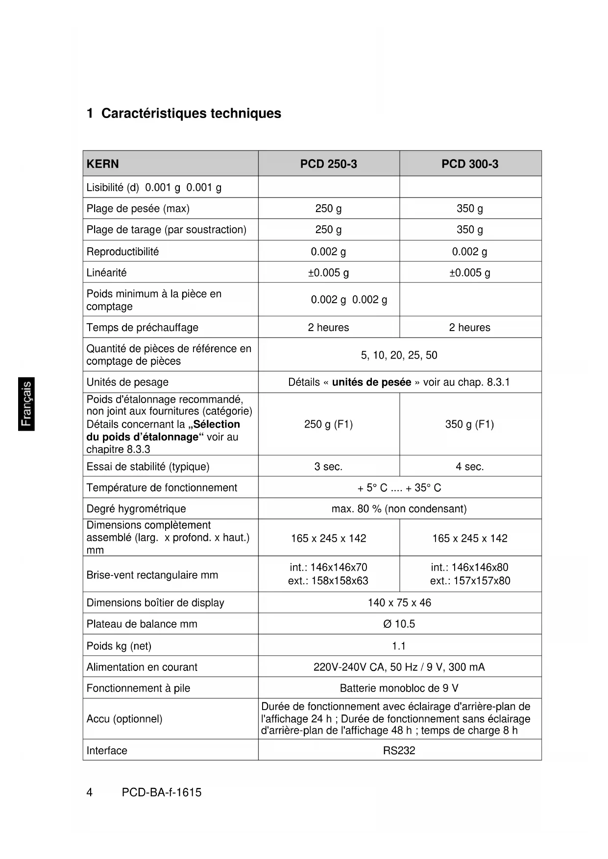 165 x 280 x 73 Dimensions boîtier de display 140 x 75 x 46 Plateau de balance mm 160x160 Poids kg (net) 1.6 1.9 Alimentation en courant 220V-240V CA, 50 Hz / 9 V, 300 mA Fonctionnement à pile Batterie monobloc de 9 V Accu (optionnel) Durée de fonctionnement avec éclairage d'arrière-plan de l'affichage 24 h ; Durée de fonctionnement sans éclairage d'arrière-plan de l'affichage 48 h ; temps de charge 8 h Interface RS2326 PCD-BA-f-1615 KERN PCD 6K-4 PCD 10K0.1 PCD 10K3 Lisibilité (d) 0.1 g 0.1 g 1 g Plage de pesée (max) 6000 g 10 kg 10 kg Plage de tarage (par soustraction) 6000 g 10 kg 10 kg Reproductibilité 0.1 g 0.1 g 1 g Linéarité ±0.3 g ±0.3 g ±3 g Poids minimum à la pièce en comptage