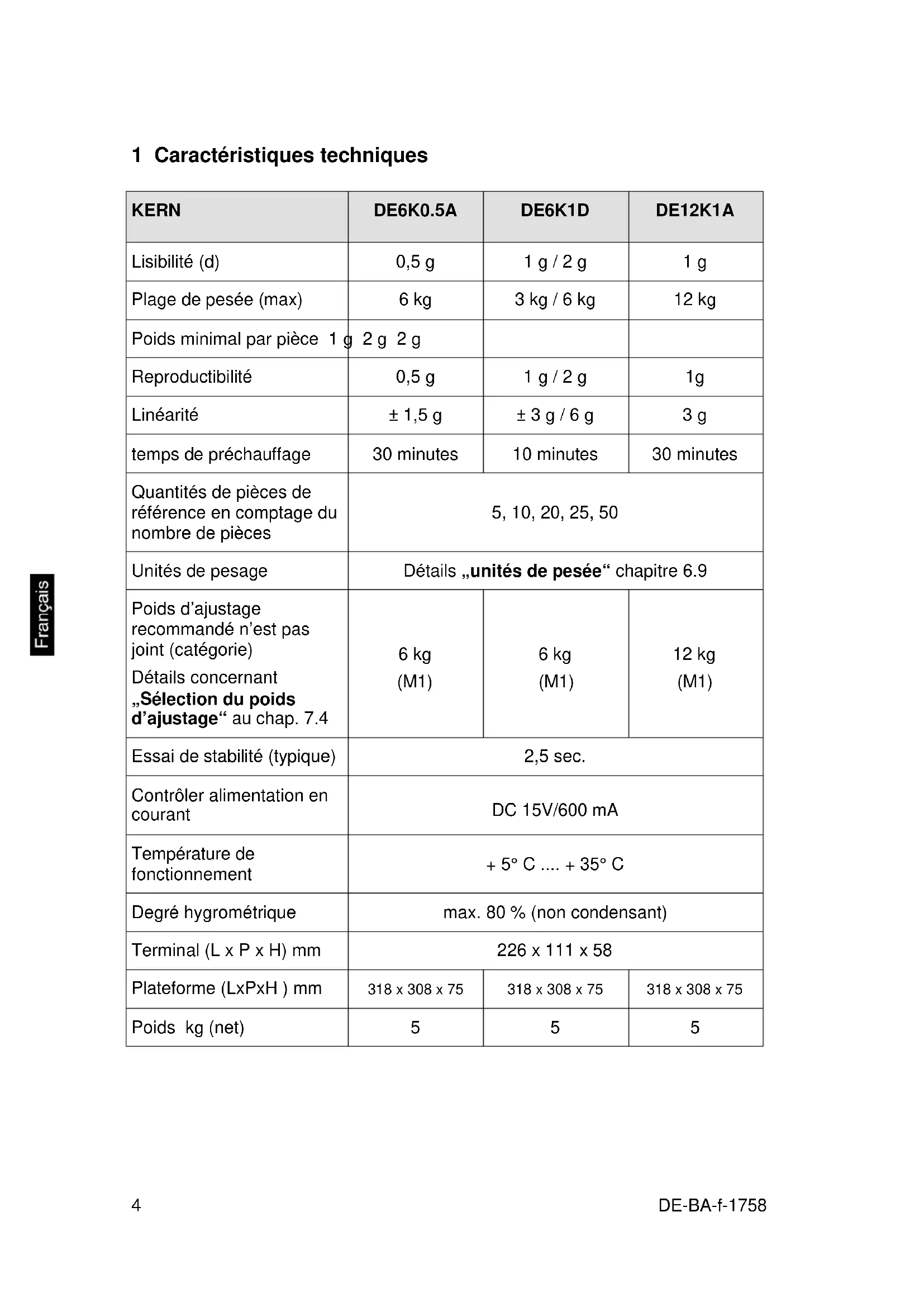 KERN DE15K0.2D DE15K2D DE24K2A Lisibilité (d) 0,2 g / 0,5 g 2 g / 5 g 2 g Plage de pesée (max) 6 kg / 15 kg 6 kg / 15 kg 24 kg Poids minimal par pièce 400 mg 4 g 4 g Reproductibilité 0,2 g / 0,5 g 2 g / 5g 2 g Linéarité ± 0,8 g / 2 g ± 6 g / 15 g ± 6 g temps de préchauffage 2 heures 10 minutes 30 minutes Quantités de pièces de référence en comptage du nombre de pièces 5, 10, 20, 25, 50 Unités de pesage Détails „unités de pesée“ chapitre 6.9 Poids d’ajustage recommandé n’est pas joint (catégorie) Détails concernant „Sélection du poids d’ajustage“ au chap. 7.4 15 kg (F2) 15 kg (M1) 20 kg (M1) Essai de stabilité (typique) 2,5 sec. Contrôler alimentation en courant DC 15V/600 mA Température de fonctionnement + 5° C .... + 35° C Degré hygrométrique max. 80 % (non condensant) Terminal (L x P x H) mm 226 x 111 x 58 Plateforme (L x P x H) mm 318 x 308 x 85 318 x 308 x 75 Poids kg (net) 7,5 5DE-BA-f-1758