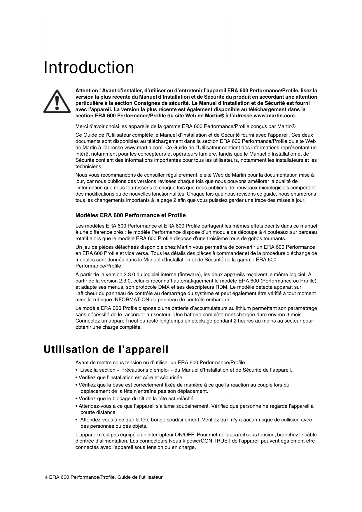 - Messages de l’afficheur ERA 600 Performance/Profile, Guide de l’utilisateur Introduction Attention ! Avant d’installer, d’utiliser ou d’entretenir l’appareil ERA 600 Performance/Profile, lisez la version la plus récente du Manuel d’Installation et de Sécurité du produit en accordant une attention particulière à la section Consignes de sécurité. Le Manuel d’Installation et de Sécurité est fourni avec l’appareil. La version la plus récente est également disponible au téléchargement dans la section ERA 600 Performance/Profile du site Web de Martin® à l’adresse www.martin.com. Merci d’avoir choisi les appareils de la gamme ERA 600 Performance/Profile conçus par Martin®. Ce Guide de l’Utilisateur complète le Manuel d’Installation et de Sécurité fourni avec l’appareil. Ces deux documents sont disponibles au téléchargement dans la section ERA 600 Performance/Profile du site Web de Martin à l’adresse www.martin.com. Ce Guide de l’Utilisateur contient des informations représentant un intérêt notamment pour les concepteurs et opérateurs lumière, tandis que le Manuel d’Installation et de Sécurité contient des informations importantes pour tous les utilisateurs, notamment les installateurs et les techniciens. Nous vous recommandons de consulter régulièrement le site Web de Martin pour la documentation mise à jour, car nous publions des versions révisées chaque fois que nous pouvons améliorer la qualité de l’information que nous fournissons et chaque fois que nous publions de nouveaux micrologiciels comportant des modifications ou de nouvelles fonctionnalités. Chaque fois que nous révisons ce guide, nous énumérons tous les changements importants à la page 2 afin que vous puissiez garder une trace des mises à jour. Modèles ERA 600 Performance et Profile Les modèles ERA 600 Performance et ERA 600 Profile partagent les mêmes effets décrits dans ce manuel à une différence près : le modèle Performance dispose d’un module de découpe à 4 couteaux sur berceau rotatif alors que le modèle ERA 600 Profile dispose d’une troisième roue de gobos tournants. Un jeu de pièces détachées disponible chez Martin vous permettra de convertir un ERA 600 Performance en ERA 600 Profile et vice versa. Tous les détails des pièces à commander et de la procédure d’échange de modules sont donnés dans le Manuel d’Installation et de Sécurité de la gamme ERA 600 Performance/Profile. A partir de la version 2.3.0 du logiciel interne (firmware), les deux appareils reçoivent le même logiciel. A partir de la version 2.3.0, celui-ci reconnaît automatiquement le modèle ERA 600 (Performance ou Profile) et adapte ses menus, son protocole DMX et ses descripteurs RDM. Le modèle détecté apparaît sur l’afficheur du panneau de contrôle au démarrage du système et peut également être vérifié à tout moment avec la rubrique INFORMATION du panneau de contrôle embarqué. Le modèle ERA 600 Profile dispose d’une batterie d’accumulateurs au lithium permettant son paramétrage sans nécessité de le raccorder au secteur. Une batterie complètement chargée dure environ 3 mois. Connectez un appareil neuf ou resté longtemps en stockage pendant 2 heures au moins au secteur pour obtenir une charge complète. Utilisation de l’appareil Avant de mettre sous tension ou d’utiliser un ERA 600 Performance/Profile : p. 294