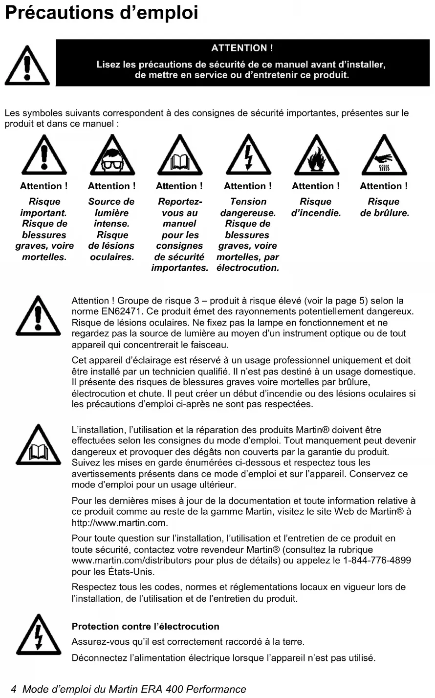 Protection contre l’électrocution Assurez-vous qu’il est correctement raccordé à la terre. Déconnectez l’alimentation électrique lorsque l’appareil n’est pas utilisé.Mode d’emploi du Martin ERA 400 Performance 5 N’ouvrez pas l’appareil et ne retirez aucun carter. Référez tout entretien non décrit dans ce manuel à un partenaire agréé du service technique Martin. Coupez l’alimentation de toute l’installation au TGBT et consignez les disjoncteurs avant d’entamer toute installation ou toute maintenance. N’utilisez qu’une source de courant alternatif conforme aux normes électriques en vigueur, et protégée contre les surcharges et les défauts de mise à la terre. Isolez immédiatement l’appareil du secteur si un joint, un carter, un câble ou tout autre composant est visiblement endommagé, défectueux, déformé, humide ou semble avoir surchauffé. Ne remettez pas le système sous tension tant que toutes les réparations n’ont pas été effectuées. Avant d’utiliser l’appareil, vérifiez que les équipements et câbles de distribution électrique sont en parfait état et qu’ils sont adaptés au lieu d’installation (y compris résistance à l’eau, à la pollution, aux changements de température et aux UV). La source lumineuse contenue dans ce luminaire doit uniquement être remplacée par le fabricant, un de ses agents techniques ou une personne aux qualifications similaires. N’exposez pas l’appareil à la pluie ou à l’humidité.