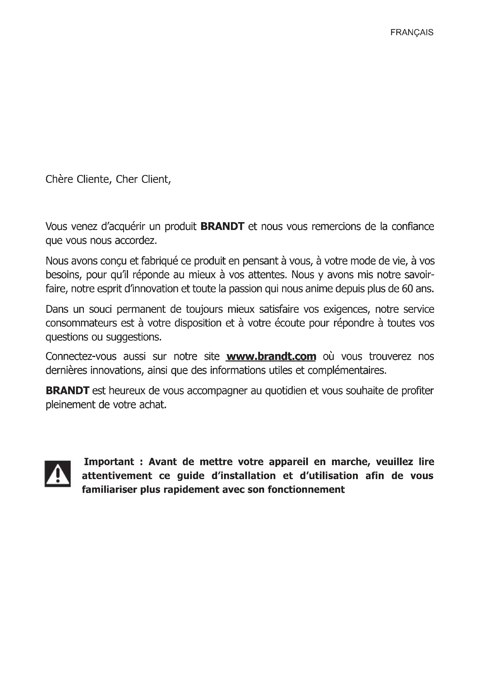 5.2FRANÇAIS Chère Cliente, Cher Client, Vous venez d’acquérir un produit BRANDT et nous vous remercions de la confiance que vous nous accordez. Nous avons conçu et fabriqué ce produit en pensant à vous, à votre mode de vie, à vos besoins, pour qu’il réponde au mieux à vos attentes. Nous y avons mis notre savoir- faire, notre esprit d’innovation et toute la passion qui nous anime depuis plus de 60 ans. Dans un souci permanent de toujours mieux satisfaire vos exigences, notre service consommateurs est à votre disposition et à votre écoute pour répondre à toutes vos questions ou suggestions. Connectez-vous aussi sur notre site www.brandt.com où vous trouverez nos dernières innovations, ainsi que des informations utiles et complémentaires. BRANDT est heureux de vous accompagner au quotidien et vous souhaite de profiter pleinement de votre achat. Important : Avant de mettre votre appareil en marche, veuillez lire attentivement ce guide d’installation et d’utilisation afin de vous familiariser plus rapidement avec son fonctionnementFRANÇAIS