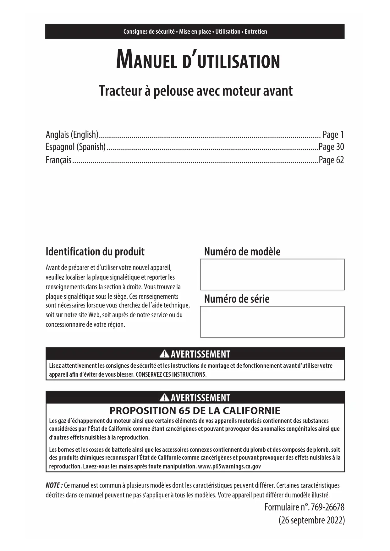 Tracteur à pelouse avec moteur avant Anglais (English) ............................................................................................................. Page 1 Espagnol (Spanish) ........................................................................................................Page 30 Français .........................................................................................................................Page 62 Consignes de sécurité • Mise en place • Utilisation • Entretien Formulaire n°. 769-26678 (26 septembre 2022) Identification du produit Avant de préparer et d’utiliser votre nouvel appareil, veuillez localiser la plaque signalétique et reporter les renseignements dans la section à droite. Vous trouvez la plaque signalétique sous le siège. Ces renseignements sont nécessaires lorsque vous cherchez de l’aide technique, soit sur notre site Web, soit auprès de notre service ou du concessionnaire de votre région. Numéro de modèle Numéro de série AVERTISSEMENT Lisez attentivement les consignes de sécurité et les instructions de montage et de fonctionnement avant d’utiliser votre appareil afin d’éviter de vous blesser. CONSERVEZ CES INSTRUCTIONS. AVERTISSEMENT