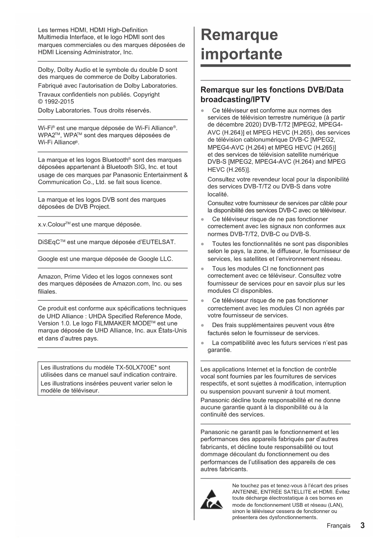 est une marque déposée de UHD Alliance, Inc. aux États-Unis et dans d’autres pays. Les illustrations du modèle TX-50LX700E* sont utilisées dans ce manuel sauf indication contraire. Les illustrations insérées peuvent varier selon le modèle de téléviseur. Remarque importante Remarque sur les fonctions DVB/Data broadcasting/IPTV ● Ce téléviseur est conforme aux normes des services de télévision terrestre numérique (à partir de décembre 2020) DVB-T/T2 [MPEG2, MPEG4- AVC (H.264)] et MPEG HEVC (H.265), des services de télévision cablonumérique DVB-C [MPEG2, MPEG4-AVC (H.264) et MPEG HEVC (H.265)] et des services de télévision satellite numérique DVB-S [MPEG2, MPEG4-AVC (H.264) and MPEG HEVC (H.265)]. Consultez votre revendeur local pour la disponibilité des services DVB-T/T2 ou DVB-S dans votre localité. Consultez votre fournisseur de services par câble pour la disponibilité des services DVB-C avec ce téléviseur. ● Ce téléviseur risque de ne pas fonctionner correctement avec les signaux non conformes aux normes DVB-T/T2, DVB-C ou DVB-S. ● Toutes les fonctionnalités ne sont pas disponibles selon le pays, la zone, le diffuseur, le fournisseur de services, les satellites et l’environnement réseau. ● Tous les modules CI ne fonctionnent pas correctement avec ce téléviseur. Consultez votre fournisseur de services pour en savoir plus sur les modules CI disponibles. ● Ce téléviseur risque de ne pas fonctionner correctement avec les modules CI non agréés par votre fournisseur de services. ● Des frais supplémentaires peuvent vous être facturés selon le fournisseur de services. ● La compatibilité avec les futurs services n’est pas garantie. Les applications Internet et la fonction de contrôle vocal sont fournies par les fournitures de services respectifs, et sont sujettes à modification, interruption ou suspension pouvant survenir à tout moment. Panasonic décline toute responsabilité et ne donne aucune garantie quant à la disponibilité ou à la continuité des services. Panasonic ne garantit pas le fonctionnement et les performances des appareils fabriqués par d’autres fabricants, et décline toute responsabilité ou tout dommage découlant du fonctionnement ou des performances de l’utilisation des appareils de ces autres fabricants. Ne touchez pas et tenez-vous à l’écart des prises ANTENNE, ENTRÉE SATELLITE et HDMI. Évitez toute décharge électrostatique à ces bornes en mode de fonctionnement USB et réseau (LAN), sinon le téléviseur cessera de fonctionner ou présentera des dysfonctionnements.Français