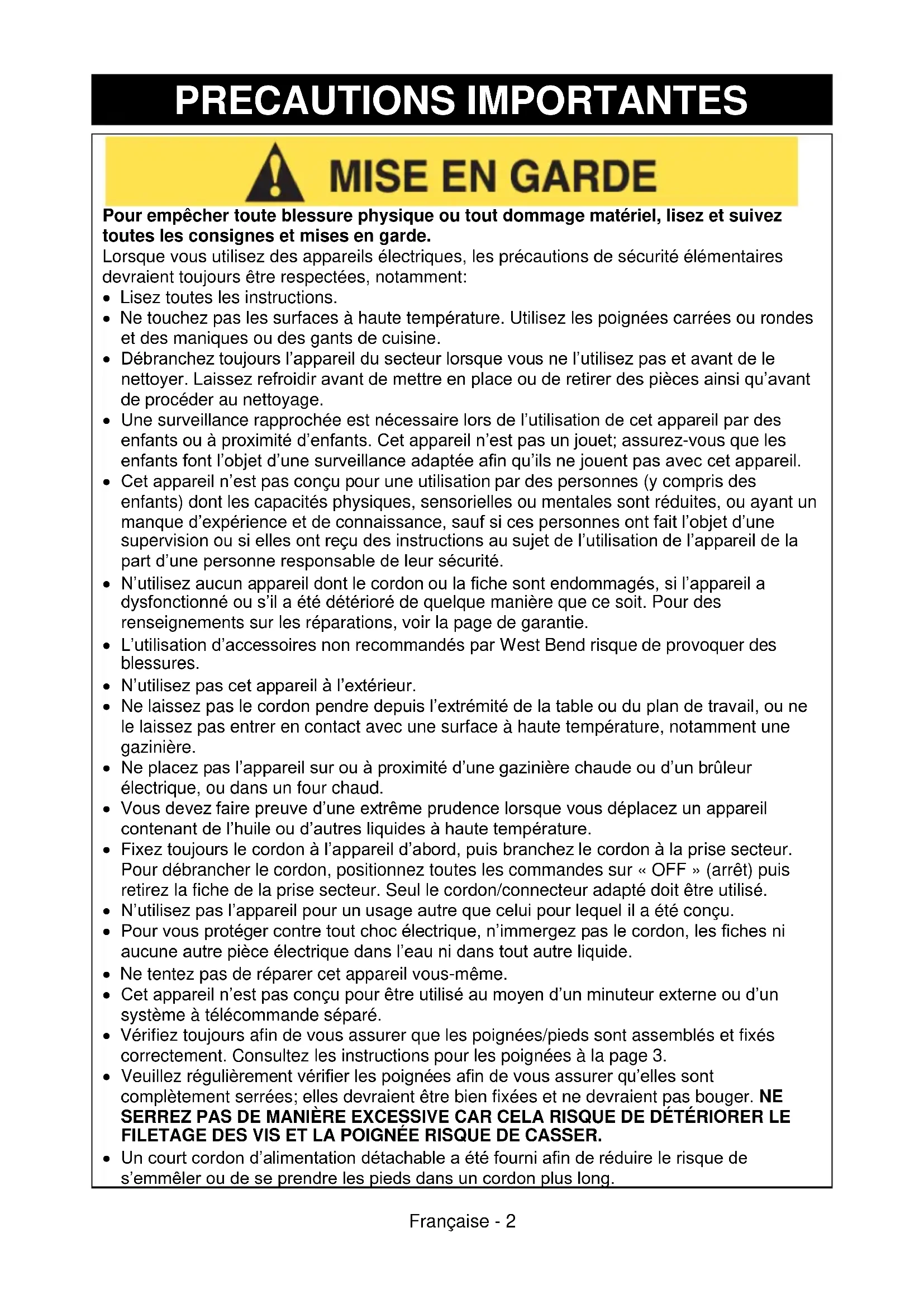- L’utilisation d’accessoires non recommandés par West Bend risque de provoquer des blessures.