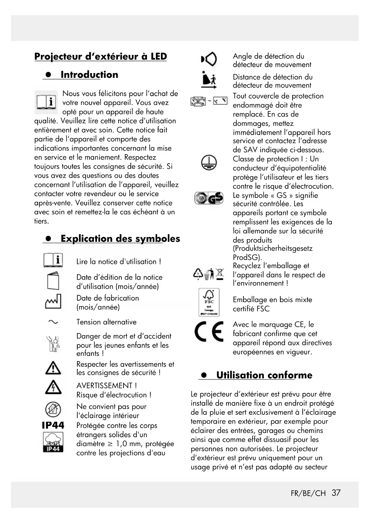 Servicio España Tel. : 00800 80040044 E-Mail: administration@mynetsend.de IAN 383230_2110 Por favor, al realizar cualquier consulta tenga a mano el recibo y el número de artículo (p. ej. IAN 123456) como comprobante de compra. Puede consultar una versión actual del manual de instrucciones en: www.citygate24.de37 FR/BE/CH Projecteur d‘extérieur à LED z Introduction Nous vous félicitons pour l‘achat de votre nouvel appareil. Vous avez opté pour un appareil de haute qualité. Veuillez lire cette notice d‘utilisation entièrement et avec soin. Cette notice fait partie de l‘appareil et comporte des indications importantes concernant la mise en service et le maniement. Respectez toujours toutes les consignes de sécurité. Si vous avez des questions ou des doutes concernant l‘utilisation de l‘appareil, veuillez contacter votre revendeur ou le service après-vente. Veuillez conserver cette notice avec soin et remettez-la le cas échéant à un tiers. z Explication des symboles Lire la notice d'utilisation ! Date d’édition de la notice d’utilisation (mois/année) Date de fabrication (mois/année) Tension alternative Danger de mort et d‘accident pour les jeunes enfants et les enfants ! Respecter les avertissements et les consignes de sécurité ! AVERTISSEMENT ! Risque d‘électrocution ! Ne convient pas pour l'éclairage intérieur IP44 Protégée contre les corps étrangers solides d'un diamètre ≥ 1,0 mm, protégée contre les projections d'eau Angle de détection du détecteur de mouvement Distance de détection du détecteur de mouvement Tout couvercle de protection endommagé doit être remplacé. En cas de dommages, mettez immédiatement l‘appareil hors service et contactez l‘adresse de SAV indiquée ci-dessous. Classe de protection I : Un conducteur d‘équipotentialité protège l‘utilisateur et les tiers contre le risque d‘électrocution. Le symbole « GS » signie sécurité contrôlée. Les appareils portant ce symbole remplissent les exigences de la loi allemande sur la sécurité des produits (Produktsicherheitsgesetz ProdSG). Recyclez l‘emballage et l‘appareil dans le respect de l‘environnement ! Emballage en bois mixte certié FSC Avec le marquage CE, le fabricant conrme que cet appareil répond aux directives européennes en vigueur. z Utilisation conforme Le projecteur d‘extérieur est prévu pour être installé de manière xe à un endroit protégé de la pluie et sert exclusivement à l‘éclairage temporaire en extérieur, par exemple pour éclairer des entrées, garages ou chemins ainsi que comme effet dissuasif pour les personnes non autorisées. Le projecteur d‘extérieur est prévu uniquement pour un usage privé et n‘est pas adapté au secteur38 FR/BE/CH commercial. Utilisez le projecteur d‘extérieur uniquement comme décrit dans cette notice d‘utilisation. Toute autre utilisation est considérée comme non conforme et peut entraîner des dommages matériels voire corporels. Le projecteur d‘extérieur n‘est pas un jouet. Le fabricant ou le revendeur décline toute responsabilité pour tout dommage occasionné par un usage non conforme ou incorrect. Ce produit renferme une source d‘éclairage de la classe d‘efcacité énergétique F. z Contenu de l’emballage 1 x projecteur d‘extérieur 1 x support mural (pour angles ou murs de maison) avec matériel de montage (4 x chevilles, 2 x vis (10 mm), 4 x vis (25 mm)) 1 x notice d‘utilisation z Description des composants