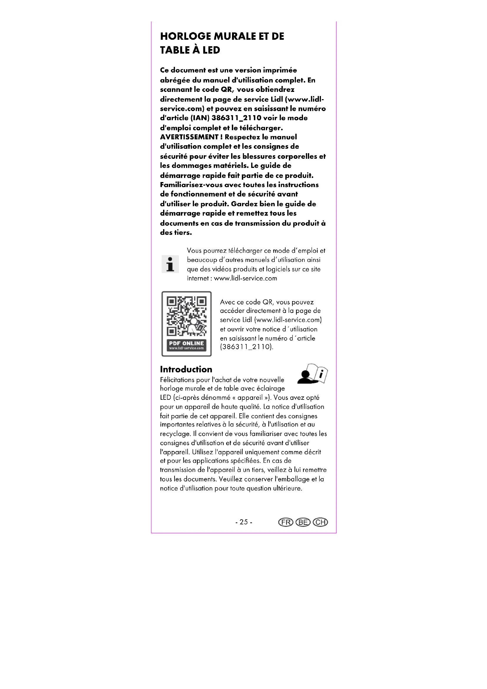 Avec ce code QR, vous pouvez accéder directement à la page de service Lidl (www.lidl-service.com) et ouvrir votre notice d´utilisation en saisissant le numéro d´article (386311_2110). Introduction Félicitations pour l'achat de votre nouvelle horloge murale et de table avec éclairage LED (ci-après dénommé « appareil »). Vous avez opté pour un appareil de haute qualité. La notice d'utilisation fait partie de cet appareil. Elle contient des consignes importantes relatives à la sécurité, à l'utilisation et au recyclage. Il convient de vous familiariser avec toutes les consignes d'utilisation et de sécurité avant d'utiliser l'appareil. Utilisez l'appareil uniquement comme décrit et pour les applications spécifiées. En cas de transmission de l'appareil à un tiers, veillez à lui remettre tous les documents. Veuillez conserver l'emballage et la notice d'utilisation pour toute question ultérieure.- 26 - Utilisation conforme L'appareil a été conçu pour afficher l'heure et remplir les fonctions supplémentaires décrites dans la notice d'utilisation. Toute autre utilisation ou modification de l'appareil est considérée comme étant non conforme. Le fabricant ne peut être tenu responsable des dommages causés par une utilisation non conforme ou inappropriée de l'appareil. L'appareil n'est pas destiné à un usage commercial. Explication des symboles