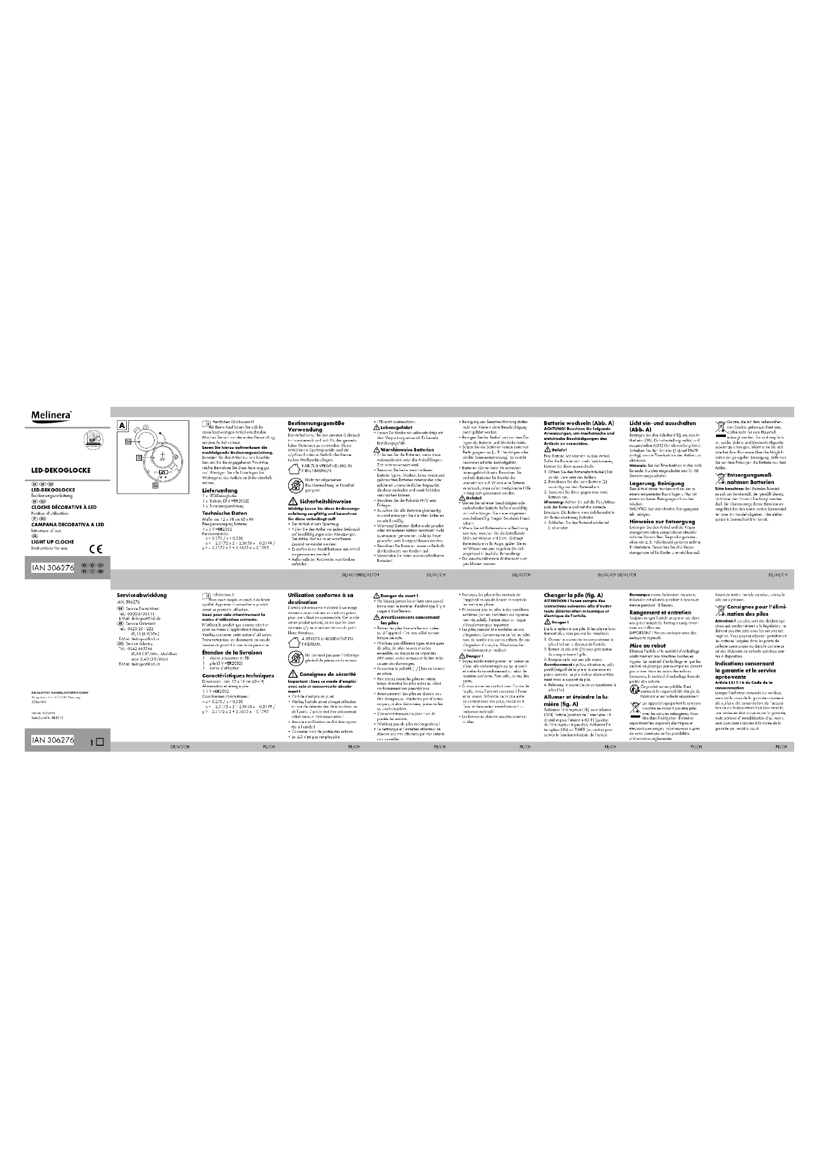 Félicitations ! Vous avez acquis un produit de haute qualité. Apprenez à connaître le produit avant sa première utilisation. Lisez pour cela attentivement la notice d’utilisation suivante. N’utilisez le produit que comme décrit et pour les zones d’application indiquées. Veuillez conserver cette notice d’utilisation. Transmettez tous les documents en cas de cession du produit à une tierce personne. Étendue de la livraison 1 cloche décorative à LED1 pile (3 V CR2032)1 notice d’utilisation Caractéristiques techniques Dimensions : env. 12 x 18 cm (Ø x H)Alimentation en énergie pile : 1 3 V CR2032Coordonnées chromatiques :— x < 0,270 / x > 0,530— y < – 2,3172 x 2 + 2,3653 x — 0,2199 / y > – 2,3172 x 2 + 2,3653 x — 0,1595 Utilisation conforme à sa destination L‘article est uniquement destiné à un usage domestique en intérieur et n‘est pas prévu pour une utilisation commerciale. Cet article est un produit spécial, parce que les coor-données x/y se situent en dehors du point blanc théorique. À UTILISER UNIQUEMENT EN INTÉRIEUR. Ne convient pas pour l’éclairage général de pièces de la maison. Consignes de sécurité Important : lisez ce mode d’emploi avec soin et conservez-le absolu-ment !• L’article n’est pas un jouet.• Vérifiez l’article avant chaque utilisation en vue de détecter des détériorations ou de l’usure. L’article doit être uniquement utilisé dans un état impeccable !• Aucune modification ne doit être appor-tée à l’article !• Conserver hors de portée des enfants.• La LED n’est pas remplaçable. Danger de mort !• Ne laissez jamais les enfants sans surveil-lance avec le matériel d’emballage. Il y a risque d’étouffement. Avertissements concernant les piles• Retirez les piles lorsqu’elles sont usées ou si l’appareil n’est pas utilisé sur une longue période.• N’utilisez pas différents types et marques de piles, de piles neuves et usées ensemble, ou des piles de capacités différentes, celles-ci risquant de fuir et de causer des dommages.• Respectez la polarité (+/-) lors de la mise en place.• Remplacez toutes les piles en même temps et mettez les piles usées au rebut conformément aux prescriptions.• Avertissement ! Les piles ne doivent pas être chargées ou réactivées par d’autres moyens, ni être démontées, jetées au feu ou court-circuitées.• Conservez toujours les piles hors de portée des enfants.• N’utilisez pas de piles rechargeables !• Le nettoyage et l’entretien utilisateur ne doivent pas être effectués par des enfants non surveillés. • Nettoyez les piles et les contacts de l’appareil en cas de besoin et avant de les mettre en place.• N’exposez pas les piles à des conditions extrêmes (par ex. radiateurs ou rayonne-ment du soleil). Il existe sinon un risque d’écoulement plus important.• Les piles peuvent être mortelles en cas d’ingestion. Conservez de ce fait les piles hors de portée des jeunes enfants. En cas d’ingestion d’une pile, il faut consulter immédiatement un médecin. Danger !• Soyez extrêmement prudent en présence d’une pile endommagée ou qui a coulé et mettez-la immédiatement au rebut de manière conforme. Pour cela, portez des gants.• Si vous entrez en contact avec l’acide de la pile, lavez l’endroit concerné à l’eau et au savon. Si l’acide de la pile entre en contact avec vos yeux, rincez-les à l’eau et demandez immédiatement un traitement médical !• Les bornes ne doivent pas être court-cir-cuitées. Changer la pile (fig. A) ATTENTION ! Tenez compte des instructions suivantes afin d’éviter toute détérioration mécanique et électrique de l’article. Danger !L’article renferme une pile. Si les pile ne fonc-tionnent plus, vous pouvez les remplacer.1. Ouvrez le couvercle du compartiment à piles (1a) sur le dessous de l‘article.2. Retirez la pile vide (2) avec précaution du compartiment à pile.3. Remplacez-la par une pile neuve.Avertissement : prêtez attention au pôle positif/négatif de la pile et à une mise en place correcte. La pile doit se situer entière-ment dans le support de pile.4. Refermez le couvercle du compartiment à piles (1a). Allumer et éteindre la lu- mière (fig. A) Actionner l‘interrupteur (1b) pour allumer (ON) l‘article (position de l‘interrupteur à droite) et pour l‘éteindre (OFF) (position de l‘interrupteur à gauche). Actionner l‘in-terrupteur (1b) sur TIMER (au centre) pour activer la fonction minuterie de l‘article.Remarque : avec la fonction minuterie, la lumière est allumée pendant 6 heures et éteinte pendant 18 heures. Rangement et entretien Toujours ranger l‘article propre et sec dans une pièce tempérée. Nettoyer uniquement avec un chiffon sec.IMPORTANT ! Ne pas nettoyer avec des nettoyants agressifs. Mise au rebut Éliminez l‘article et le matériel d‘emballage conformément aux directives locales en vigueur. Le matériel d‘emballage tel que les sachets en plastique par exemple ne doivent pas arriver dans les mains des enfants. Conservez le matériel d‘emballage hors de portée des enfants. Ce produit est recyclable. Il est soumis à la responsabilité élargie du fabricant et est collecté séparément.Les appareils qui portent le symbole ci-contre ne doivent pas être jetés avec les ordures ménagères. Vous êtes dans l‘obligation d‘éliminer séparément les appareils électriques et électroniques usagés. Informez-vous auprès de votre commune sur les possibilités d‘élimination réglementée. Avant de mettre l‘article au rebut, retirez la pile qui s‘y trouve. Consignes pour l’élimi- nation des piles Attention ! Les piles sont des déchets spé-ciaux qui, conformément à la législation, ne doivent pas être jetés avec les ordures mé-nagères. Vous pouvez déposer gratuitement les batteries usagées dans les points de collecte communaux ou dans le commerce où des récip