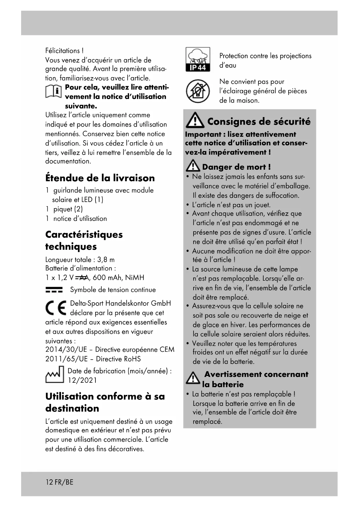- Positionnez l’interrupteur Marche/Arrêt sur OFF. L’article est éteint de manière permanente. Stockage, nettoyage Lorsque vous n’utilisez pas l’article, rangez-le toujours éteint dans un endroit sec et propre à une température ambiante. Nettoyez uniquement avec un chiffon de nettoyage humide, puis essuyez. IMPORTANT ! Ne jamais laver avec des produits de nettoyage agressifs. FR/BE14 FR/BE Mise au rebut Afin de protéger l’environnement, ne jetez pas votre article avec les ordures ménagères lorsqu’il ne vous est plus utile, mais jetez-le de façon appropriée. Vous pouvez obtenir des infor- mations sur les points de collecte et leurs heures d’ouverture auprès des autorités compétentes de votre localité. Les piles/batteries défectueuses ou usa- gées doivent être recyclées conformément à la directive 2006/66/CE et à ses amen- dements. Retournez les piles/batteries et/ ou l’article à travers les possibilités de collecte offertes. Les matériaux d’embal- lage comme les sacs plastique ne doivent pas tomber entre les mains des enfants. Gardez le matériel d’emballage hors de la portée des enfants. Dommages environnementaux dus à l’élimination inappropriée des piles/batteries ! Les piles/batteries ne doivent pas être jetées avec les ordures ménagères. Elles peuvent contenir des métaux lourds toxiques et sont soumises à un traitement spécial des déchets. Les symboles chimiques des métaux lourds sont les suivants : Cd = cadmium, Hg = mercure, Pb = plomb. Alors, retournez les piles/batteries usagées à un point de collecte municipal. Ce produit est recyclable. Il est soumis à la responsabilité élargie du fabricant et est collecté séparément. Jetez l’article et l’emballage dans le respect de l’environnement. Notez le marquage des matériaux d’emballage lors du tri des déchets. Ceux-ci sont marqués par les abréviations (a) et les chiffres (b) avec la signification suivante : 1 - 7 : plas- tique/20 - 22 : papier et carton/80 - 98: matériaux composites. L’article et les matériaux d’emballage sont recyclables. Éliminez-les séparément pour une meilleure gestion des déchets. Le logo Triman ne s’applique qu’à la France. Vous pouvez vous renseigner auprès des auto- rités locales ou municipales pour savoir comment vous débarrasser de l’article mis au rebut. Indications concernant la garantie et le service après-vente L’article a été produit avec grand soin et sous un contrôle constant. DELTA-SPORT HANDELSKONTOR GmbH accorde au client final privé une garantie de trois ans sur cet article à compter de la date d’achat (période de garantie) confor- mément aux dispositions suivantes. La garantie ne vaut que pour les défauts de matériaux et de fabrication. La garantie ne couvre pas les pièces soumises à une usure normale, lesquelles doivent donc être considérées comme des pièces d’usure (comme par ex. les piles), de même qu’elle ne couvre pas les pièces fragiles, telles que les interrupteurs, les batteries ou les pièces fabriquées en verre. Les réclamations au titre de cette garantie sont exclues si l’article a été utilisé de manière abusive ou inappropriée, hors du cadre de son usage ou du champ d’appli- cation prévu ou si les instructions de la no- tice d’utilisation n’ont pas été respectées, à moins que le client final ne prouve que l´article présentait un défaut de matériau ou de fabrication n´étant pas dû à l’une des conditions mentionnées ci-dessus. Les réclamations au titre de la garantie ne peuvent être adressées pendant la période de garantie qu’en présentant le ticket de caisse original. Veuillez pour cela conserver le ticket de caisse original. Ceci s’applique également aux pièces rempla- cées et réparées.15 Si vous avez des plaintes à formuler, veuillez d’abord contacter le service d’assistance téléphonique ci-dessous ou nous contacter par courrier électronique. Si le cas est couvert par la garantie, nous nous enga- geons - à notre appréciation - à réparer ou à remplacer l’article gratuitement pour vous ou à vous rembourser le prix d’achat. Aucun autre droit ne découle de la garantie. Vos droits légaux, en particulier les droits de garantie contre le vendeur concerné, ne sont pas limités par cette garantie. Article L217-16 du Code de la consommation Lorsque l‘acheteur demande au vendeur, pendant le cours de la garantie com- merciale qui lui a été consentie lors de l‘acquisition ou de la réparation d‘un bien meuble, une remise en état couverte par la garantie, toute période d‘immobilisation d‘au moins sept jours vient s‘ajouter à la durée de la garantie qui restait à courir. Cette période court à compter de la demande d‘intervention de l‘acheteur ou de la mise à disposition pour réparation du bien en cause, si cette mise à disposition est postérieure à la demande d‘intervention. Indépendamment de la garantie commer- ciale souscrite, le vendeur reste tenu des défauts de conformité du bien et des vices rédhibitoires dans les conditions prévues aux articles L217-4 à L217-13 du Code de la consommation et aux articles 1641 à 1648 et 2232 du Code Civil. Article L217-4 du Code de la consommation Le vendeur livre un bien conforme au contrat et répond des défauts de conformi- té existant lors de la délivrance. Il répond également des défauts de conformité résultant de l‘emballage, des instructions de montage ou de l‘installation lorsque celle-ci a été mise à sa charge par le contrat ou a été réalisée sous sa responsabilité. Article L217-5 du Code de la consommation Le bien est conforme au contrat : 1° S´il est propre à l‘usage habituelle- ment attendu d‘un bien semblable et, le cas échéant :
