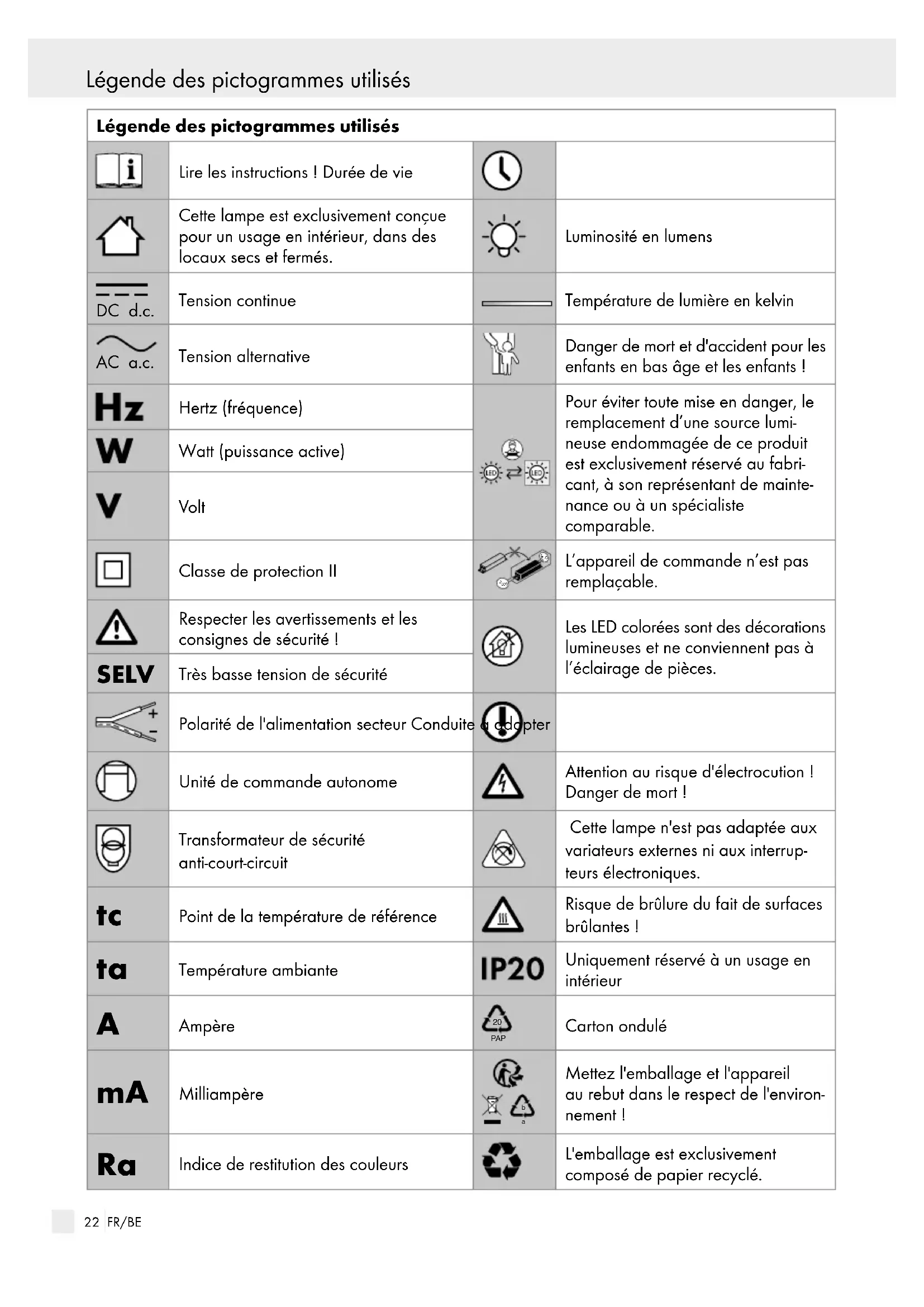 Indice de restitution des couleurs L'emballage est exclusivement composé de papier recyclé. Légende des pictogrammes utilisés/Introduction23 FR/BE Légende des pictogrammes utilisés Légende des pictogrammes utilisés/Introduction Légende des pictogrammes utilisés