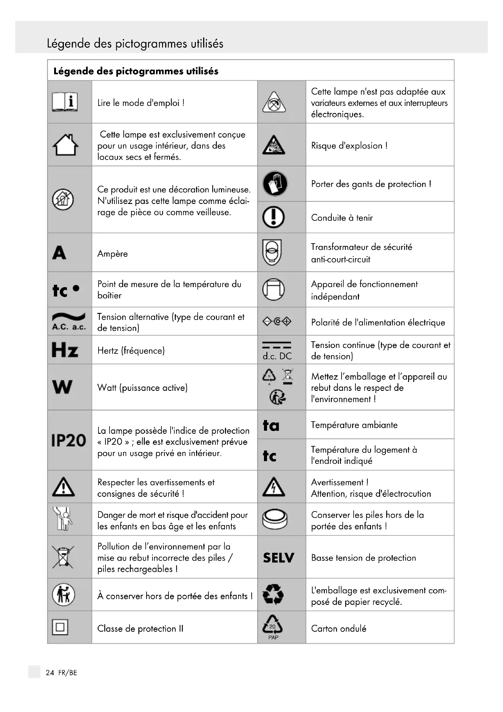 Bande adhésive Légende des pictogrammes utilisés/Introduction26 FR/BE Caractéristiques techniques Lampe : No. de modèle: 14164900L Tension nominale: 230–240 V