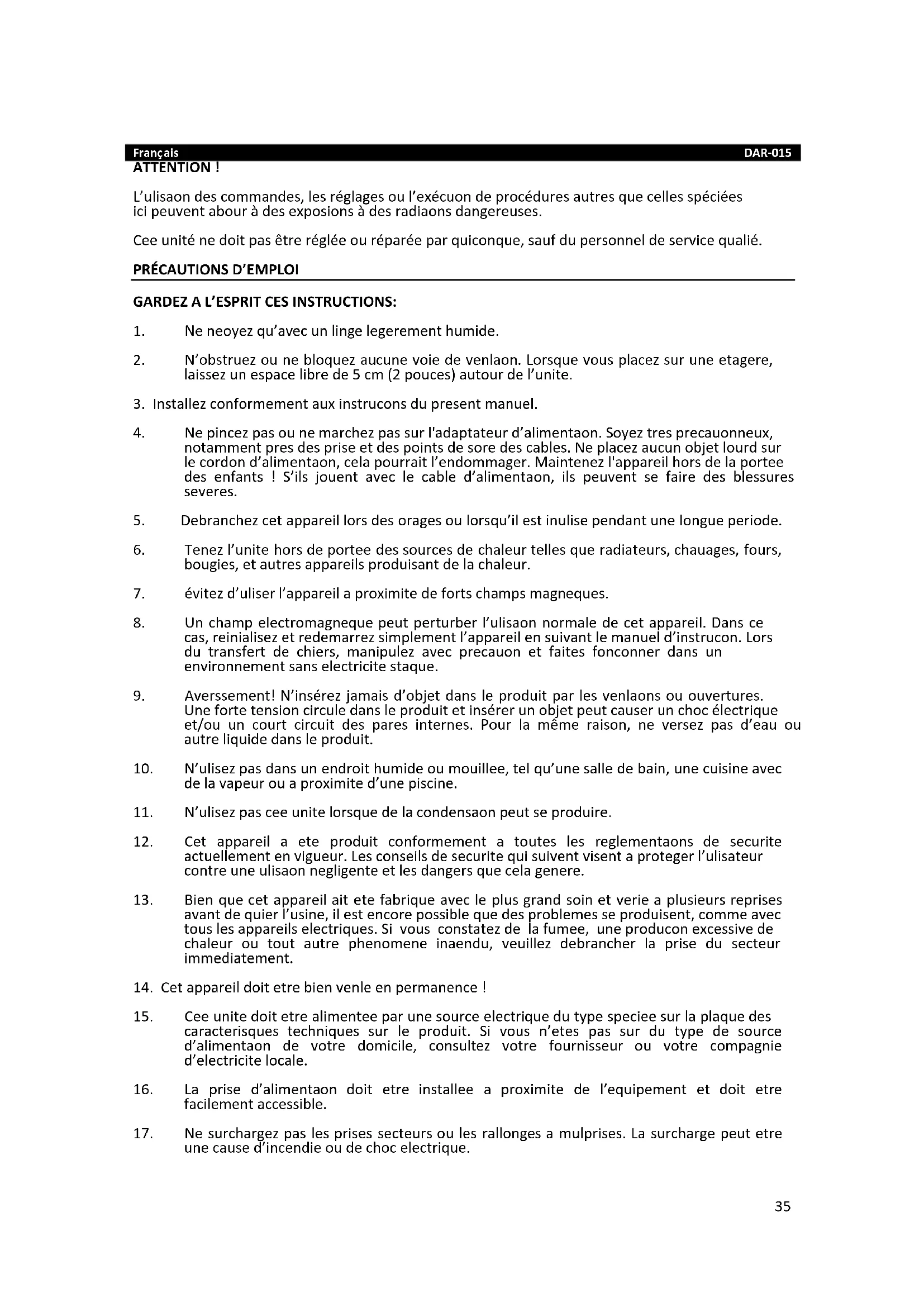 15. Cette unite doit etre alimentee par une source electrique du type specifiee sur la plaque des