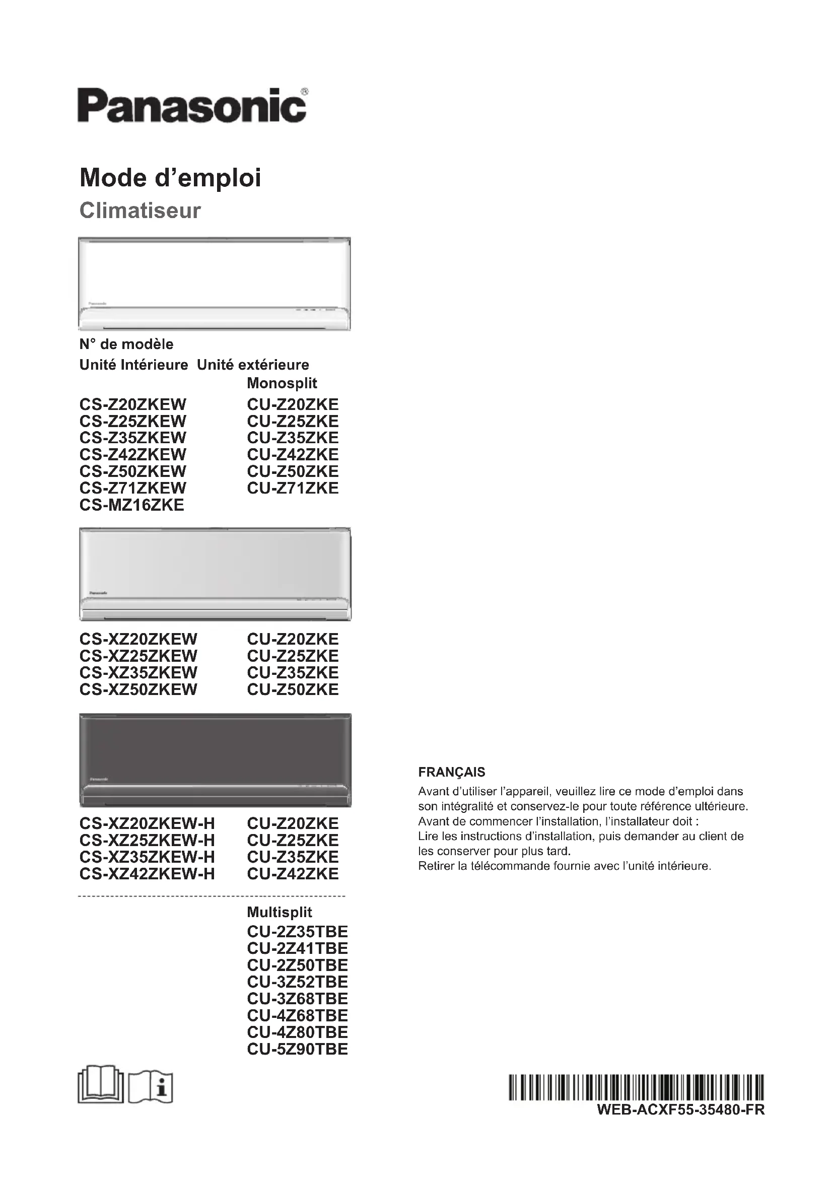 Mode d’emploi Climatiseur FRANÇAIS Avant d’utiliser l’appareil, veuillez lire ce mode d’emploi dans son intégralité et conservez-le pour toute référence ultérieure.Avant de commencer l’installation, l’installateur doit :Lire les instructions d’installation, puis demander au client de les conserver pour plus tard.Retirer la télécommande fournie avec l’unité intérieure. N° de modèle Unité Intérieure Unité extérieure CS-Z20ZKEW CS-Z25ZKEW CS-Z35ZKEW CS-Z42ZKEW CS-Z50ZKEW CS-Z71ZKEW CS-MZ16ZKE Monosplit CU-Z20ZKE CU-Z25ZKE CU-Z35ZKE CU-Z42ZKE CU-Z50ZKE CU-Z71ZKE CS-XZ20ZKEW CS-XZ25ZKEW CS-XZ35ZKEW CS-XZ50ZKEW CU-Z20ZKE CU-Z25ZKE CU-Z35ZKE CU-Z50ZKE CS-XZ20ZKEW-H CS-XZ25ZKEW-H CS-XZ35ZKEW-H CS-XZ42ZKEW-H CU-Z20ZKE CU-Z25ZKE CU-Z35ZKE CU-Z42ZKE Multisplit