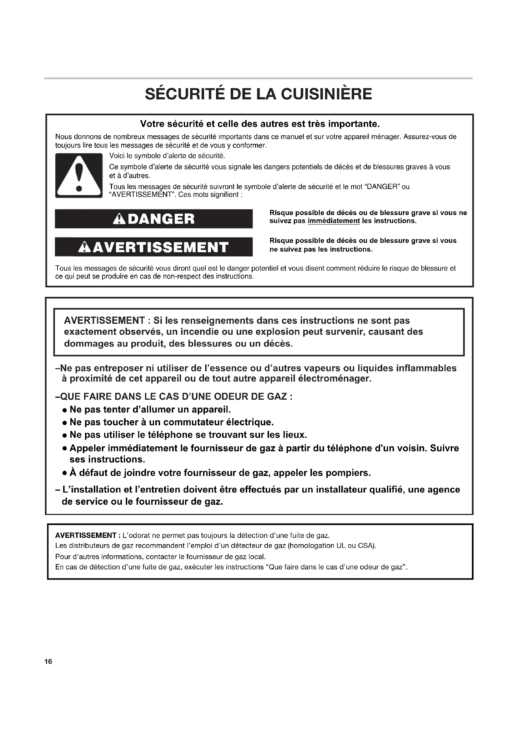 AVERTISSEMENT : L’odorat ne permet pas toujours la détection d’une fuite de gaz.