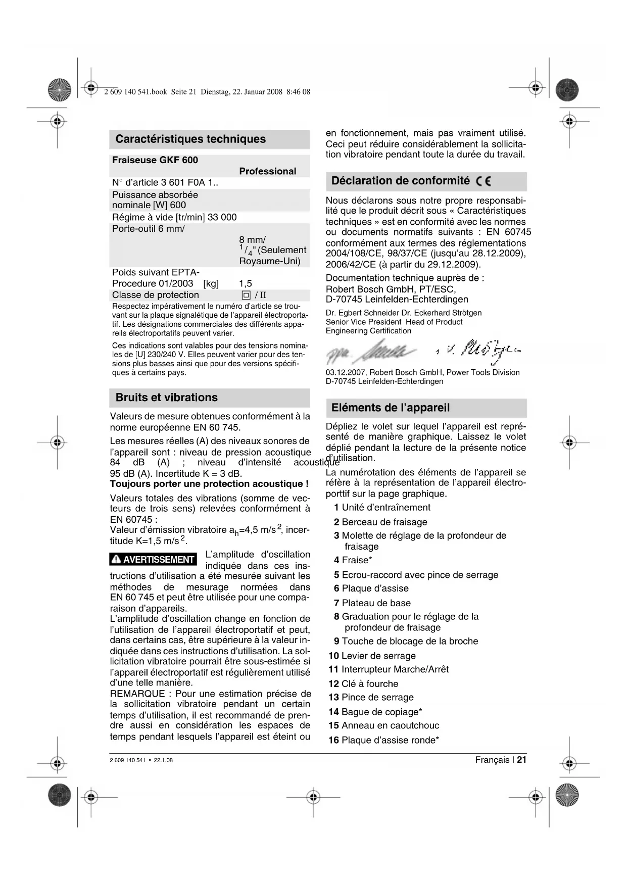 " (Seulement Royaume-Uni) Poids suivant EPTA- Procedure 01/2003 [kg] 1,5 Classe de protection / II Respectez impérativement le numéro d’article se trou- vant sur la plaque signalétique de l’appareil électroporta- tif. Les désignations commerciales des différents appa- reils électroportatifs peuvent varier. Ces indications sont valables pour des tensions nomina- les de [U] 230/240 V. Elles peuvent varier pour des ten- sions plus basses ainsi que pour des versions spécifi- ques à certains pays. Bruits et vibrations AVERTISSEMENT Déclaration de conformité Eléments de l’appareil 2 609 140 541.book Seite 21 Dienstag, 22. Januar 2008 8:46 082 609 140 541 • 22.1.08 22 | Français 17 Vis de fixation pour plaque d’assise (4 x) 18 Pointe de centrage* 19 Vis moletée pour blocage de la butée 20 Butée parallèle 21 Vis papillon pour la butée parallèle 22 Aide de guidage 23 Vis papillon pour orientation horizontale de l’aide de guidage 24 Vis papillon pour fixation de l’orientation horizontale 25 Carter du berceau de fraisage* 26 Berceau de fraisage angulaire* 27 Vis papillon pour modification d’angle 28 Graduation pour modification de l’angle de fraisage 29 Poignée* 30 Carter d‘aspiration* 31 Adaptateur d’aspiration* 32 Plaque d’assise avec manette et adaptateur d’aspiration*