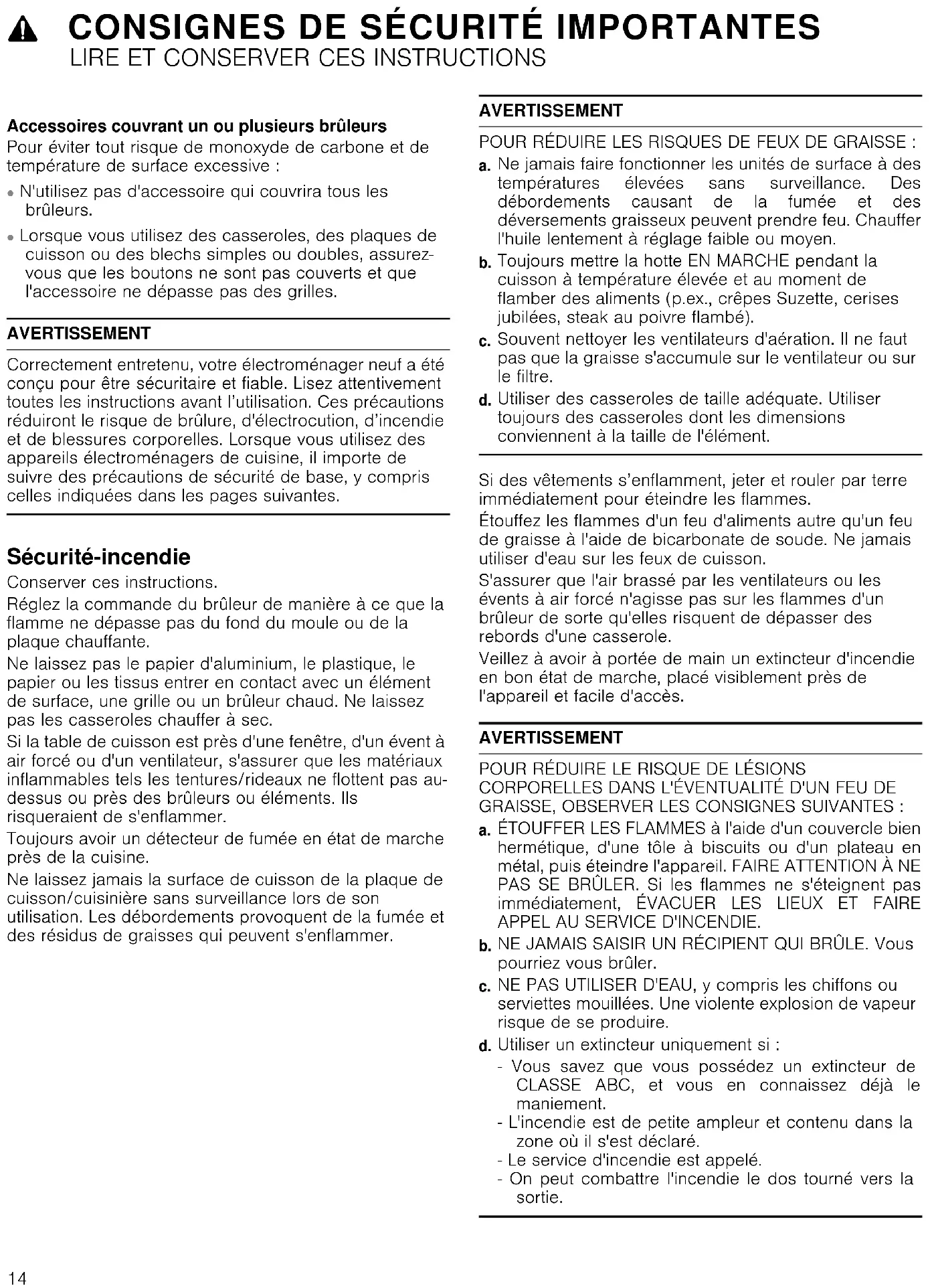 Utiliser des casseroles de taille adéquate. Utiliser toujours des casseroles dont les dimensions conviennent à la taille de l'élément. Si des vêtements s’enflamment, jeter et rouler par terre immédiatement pour éteindre les flammes. Étouffez les flammes d'un feu d'aliments autre qu'un feu de graisse à l'aide de bicarbonate de soude. Ne jamais utiliser d'eau sur les feux de cuisson. S'assurer que l'air brassé par les ventilateurs ou les évents à air forcé n'agisse pas sur les flammes d'un brûleur de sorte qu'elles risquent de dépasser des rebords d'une casserole. Veillez à avoir à portée de main un extincteur d'incendie en bon état de marche, placé visiblement près de l'appareil et facile d'accès. AVERTISSEMENT POUR RÉDUIRE LE RISQUE DE LÉSIONS CORPORELLES DANS L'ÉVENTUALITÉ D'UN FEU DE GRAISSE, OBSERVER LES CONSIGNES SUIVANTES :