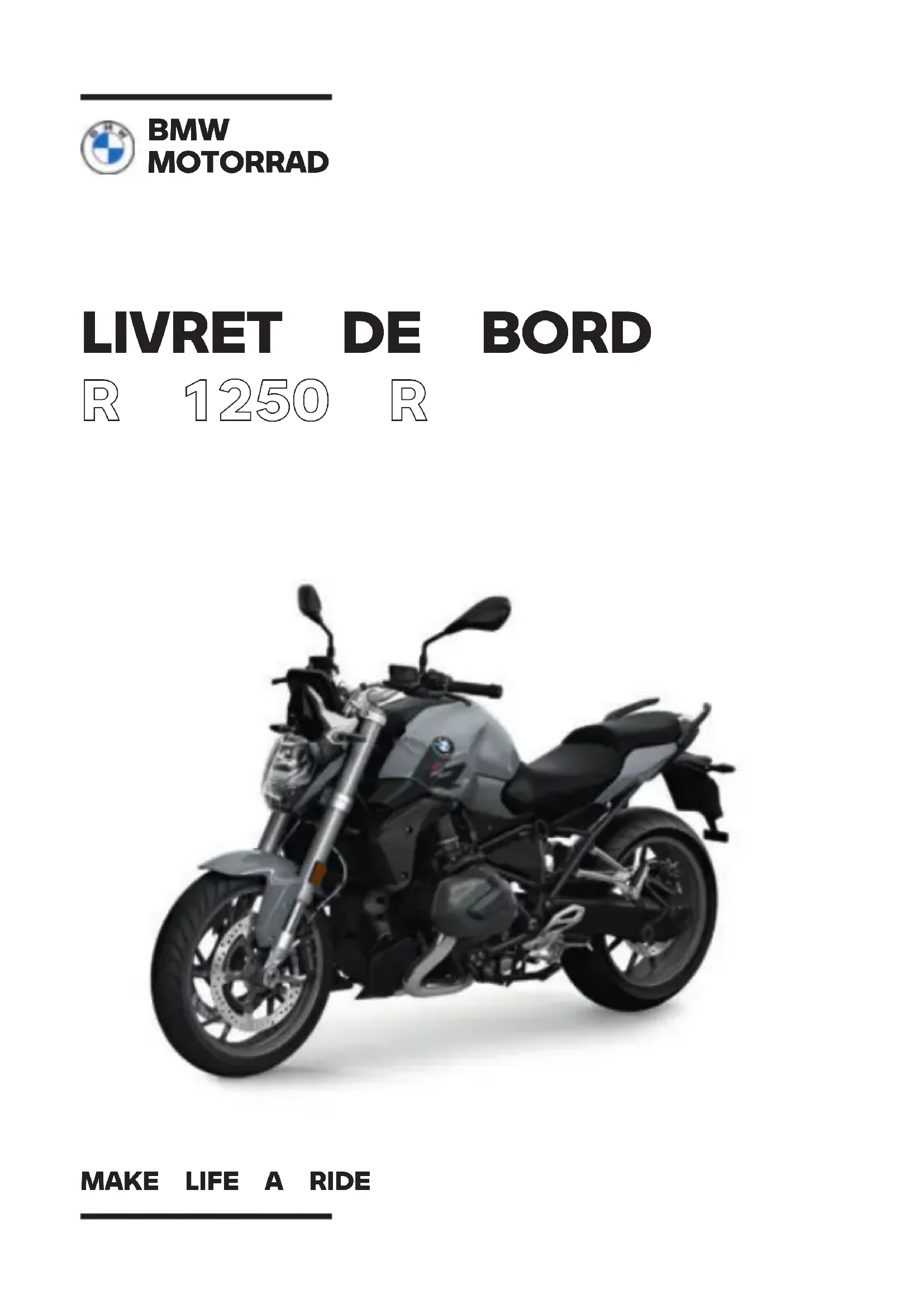R 1250 R BMW MOTORRAD MAKE LIFE A RIDEDonnées de la moto Modèle Numéro d'identification du véhicule Code couleur Première immatriculation N° d'immatriculation Données du concessionnaire Interlocuteur au service après-vente Madame/Monsieur N° de téléphone Adresse du concessionnaire/Téléphone (cachet de la société)VOTRE BMW. Nous vous félicitons d'avoir porté votre choix sur un véhicule de BMW Motorrad et avons le plaisir de vous accueillir dans le cercle des pilotes BMW. Familiarisez-vous avec votre nouveau véhicule afin d'être en mesure de vous déplacer en toute sécurité sur les routes. À propos de ce livret de bord Lisez le livret de bord avant de démarrer votre nouvelle BMW. Vous y trouverez des indications importantes concernant l'utilisa- tion du véhicule qui vous permettront de profiter pleinement des avantages techniques de votre BMW. Vous y trouverez également des informations sur l'entretien et la maintenance de façon à assurer la sécurité de fonctionnement, la sécurité routière et une conservation optimale de la valeur de votre véhicule. Si vous étiez amené à vendre un jour votre BMW, pensez à re- mettre le livret de bord. Il fait partie intégrante de la moto. Nous espérons que votre BMW vous donnera entière satisfaction et vous souhaitons bonne route BMW Motorrad.01