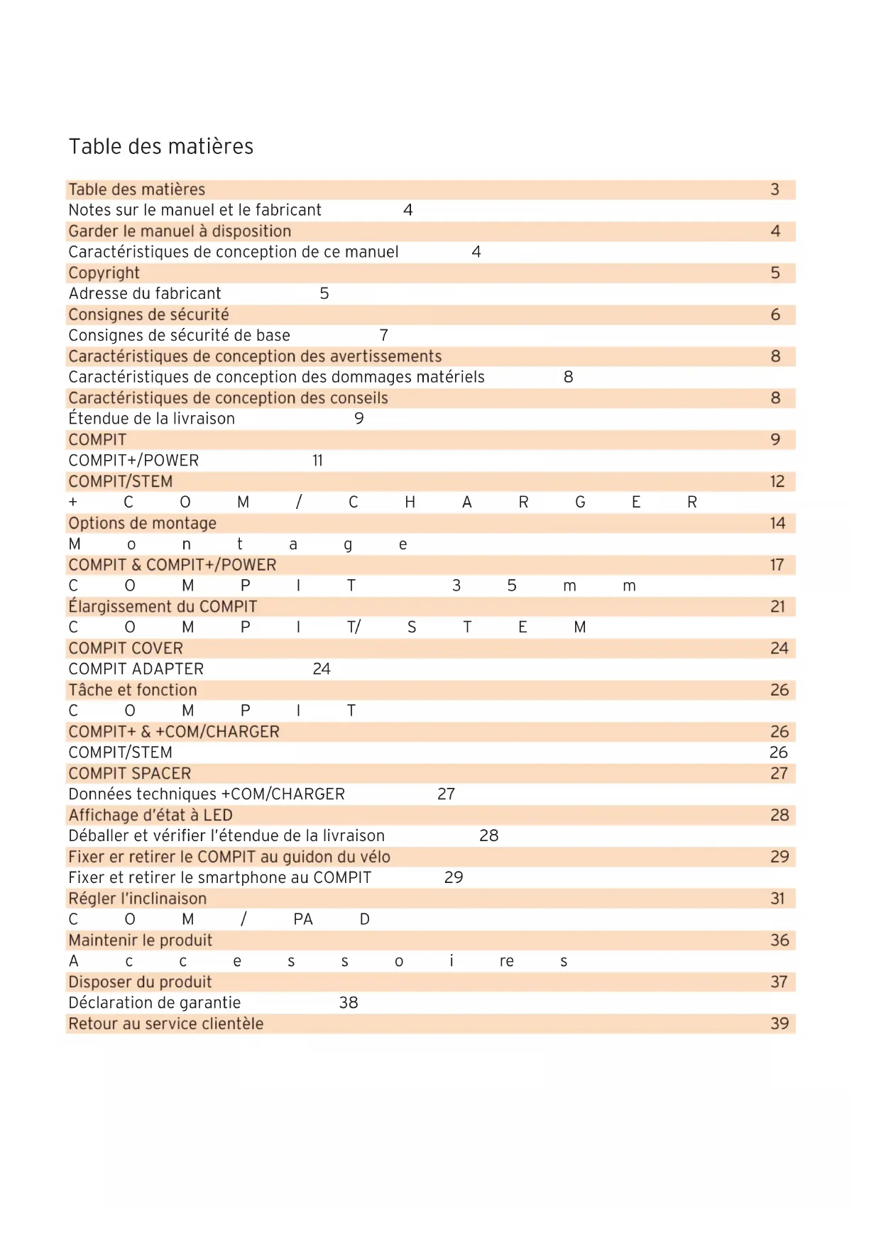 COMPIT/STEM 26 COMPIT SPACER 27 Données techniques +COM/CHARGER 27 Affichage d’état à LED 28 Déballer et vérifier l’étendue de la livraison 28 Fixer er retirer le COMPIT au guidon du vélo 29 Fixer et retirer le smartphone au COMPIT 29 Régler l’inclinaison 31 COM/PAD 32 Maintenir le produit 36 Accessoires 36 Disposer du produit 37 Déclaration de garantie 38 Retour au service clientèle 39Remarques sur la notice et sur le fabricant Remarques sur la notice et sur le fabricant La présente notice vous aide à utiliser en toute sécurité la famille de produits COMPIT, COMPIT