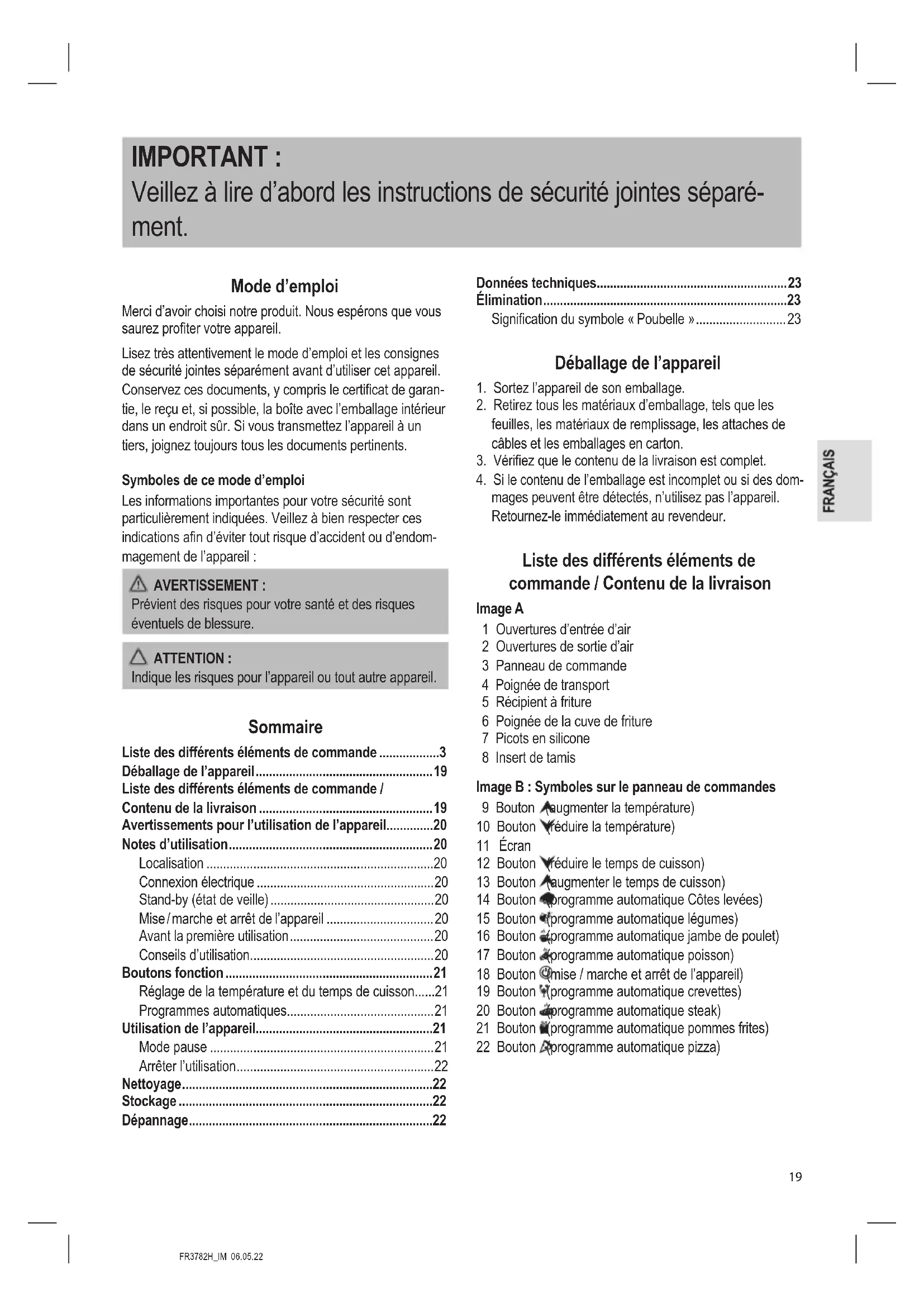 mages peuvent être détectés, n’utilisez pas l’appareil. Retournez-le immédiatement au revendeur. Liste des différents éléments de commande / Contenu de la livraison Image A 1 Ouvertures d’entrée d’air 2 Ouvertures de sortie d’air 3 Panneau de commande 4 Poignée de transport 5 Récipient à friture 6 Poignée de la cuve de friture 7 Picots en silicone 8 Insert de tamis Image B : Symboles sur le panneau de commandes 9 Bouton (augmenter la température) 10 Bouton (réduire la température) 11 Écran 12 Bouton (réduire le temps de cuisson) 13 Bouton (augmenter le temps de cuisson) 14 Bouton (programme automatique Côtes levées) 15 Bouton (programme automatique légumes) 16 Bouton (programme automatique jambe de poulet) 17 Bouton (programme automatique poisson) 18 Bouton (mise / marche et arrêt de l’appareil) 19 Bouton (programme automatique crevettes) 20 Bouton (programme automatique steak) 21 Bouton (programme automatique pommes frites) 22 Bouton (programme automatique pizza)FR3782H_IM 06.05.22